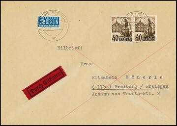 40 Pfg. im Paar als seltene Mehrfachfrankatur-Variante auf sauber gestempeltem Orts-Eil-Doppelbrief aus Freiburg, 24.12.49