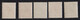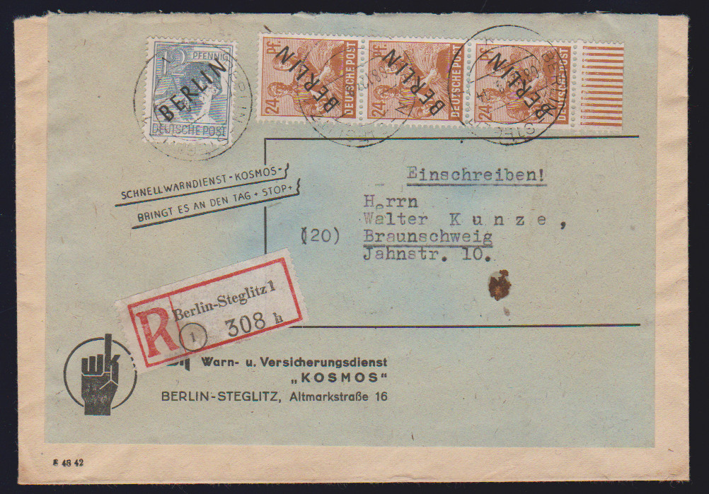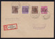 Schwarzaufdruck, vier bessere Belege: 12 u. Dreierstreifen 24 Pfg. (einmal AFII!) auf R-Brief, ferner je zweimal 24 Pfg. SA in MiF mit 60 Pfg. Rotaufdruck (deutlich untersch. Urmarken!) auf zwei R-Briefen, sowie EF 50 Pfg. auf Auslandsbrief