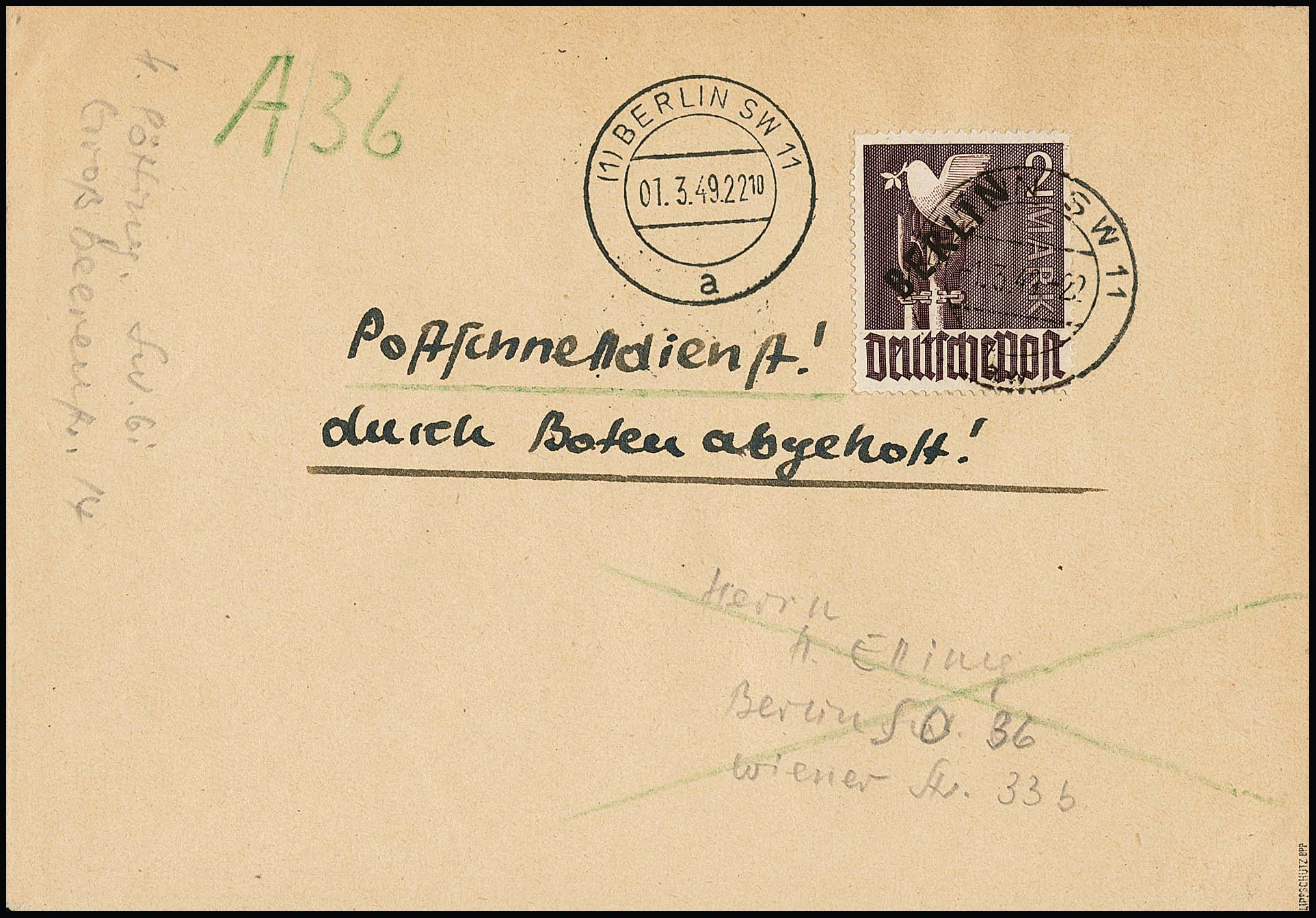 2 Mk. Schwarzaufdruck als sehr seltene Einzelfrankatur auf portogerechtem Orts-Postschnelldienstbrief vom Ersttag des Postschnelldienstes, 1.3.49. Sowohl seltene Einzelfrankatur-Variante als auch bisher einzig bekannter Brief mit der 2 Mark Schwarzaufdruck vom Ersttag des Postschnelldienstes, Unikat. Sign. Lippschütz und Attest A. Schlegel. Foto siehe Titelseite