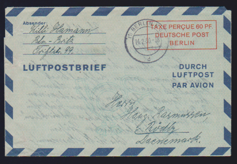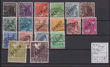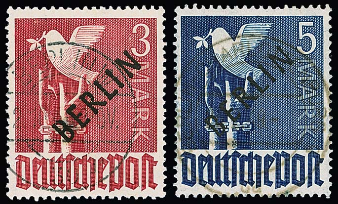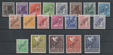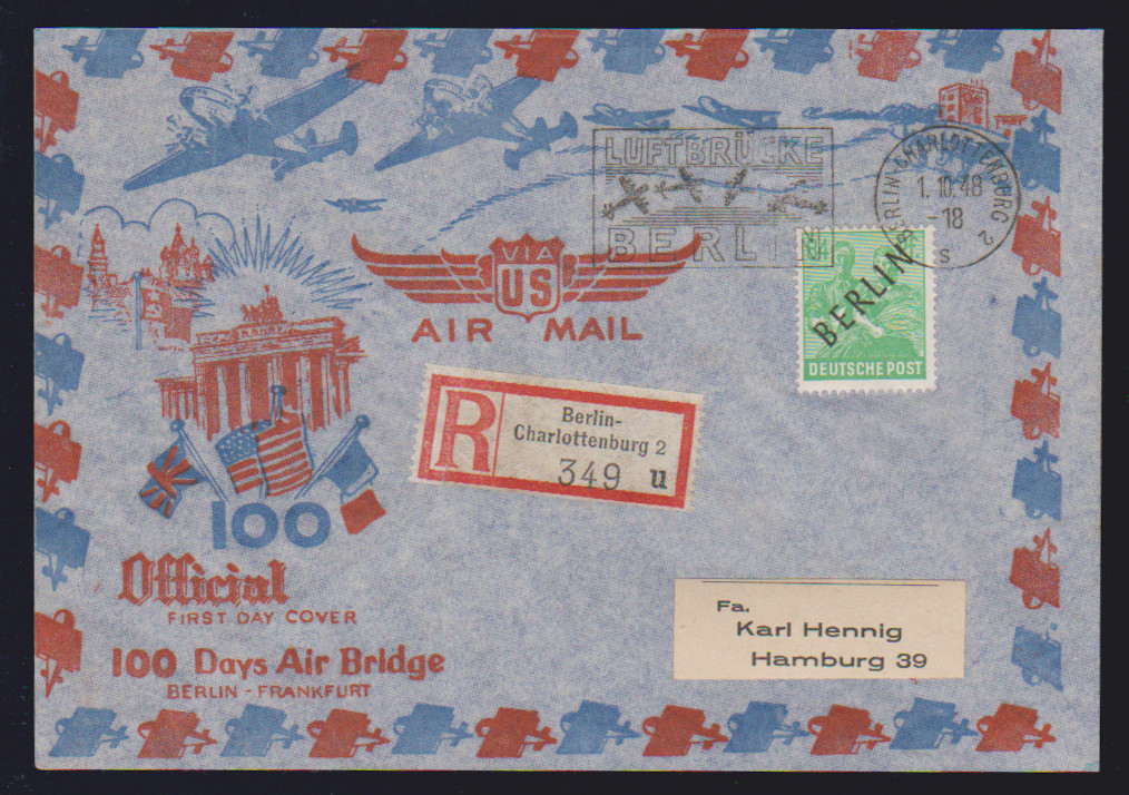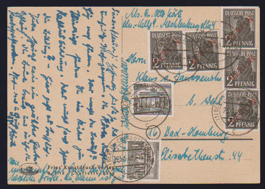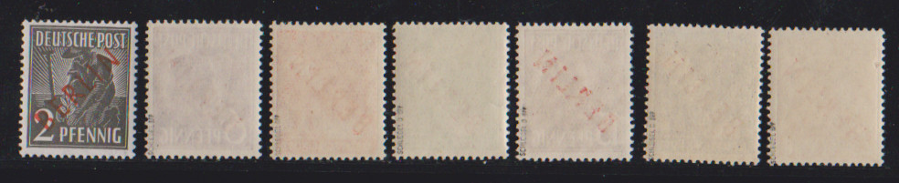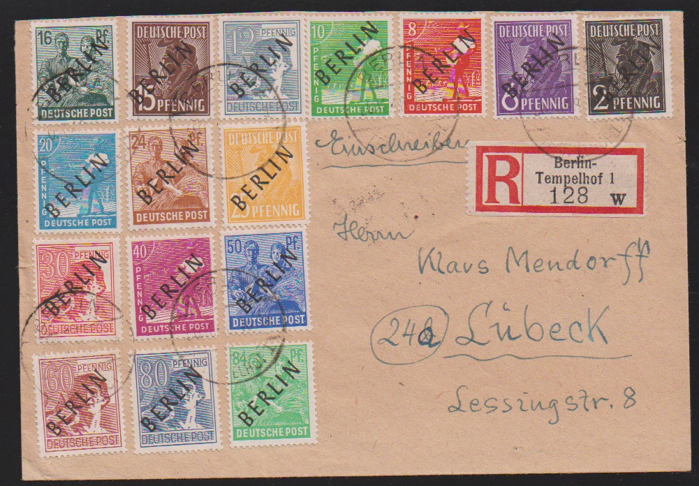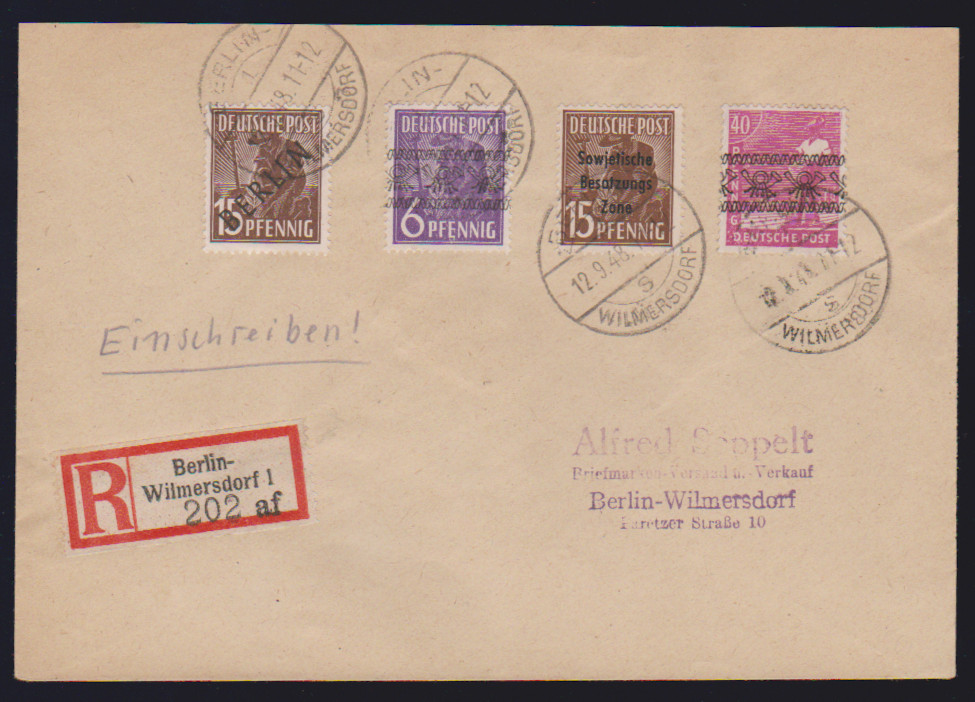 2 Pfg. Schwarzaufdruck im Paar, nebst dreimal 2 Pfg. Rotaufdruck, als unbeanstandete 10 Pfg.-Frankatur auf Ortsbrief Berlin, 28.1.50. Ferner 15 Pfg. Schwarzaufdruck nebst u.a. 15 Pfg. SBZ-Maschinenaufdruck auf Orts-R-Brief, 84 Pfg. SA als EF auf R-Brief, sowie 2 Pfg. Rotaufdruck per fünf nebst zweimal 1 Pfg. Bauten auf Fernpostkarte