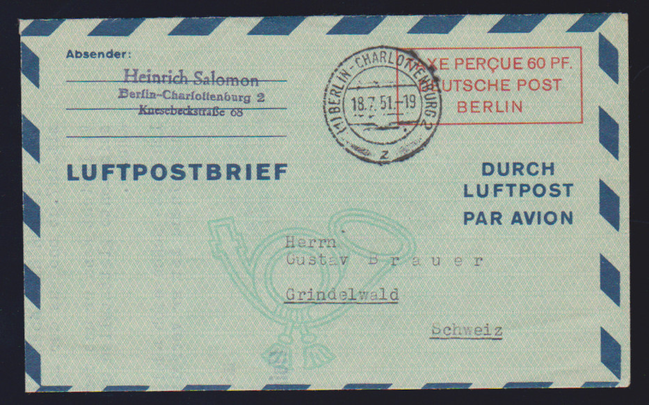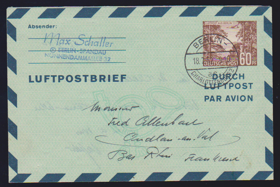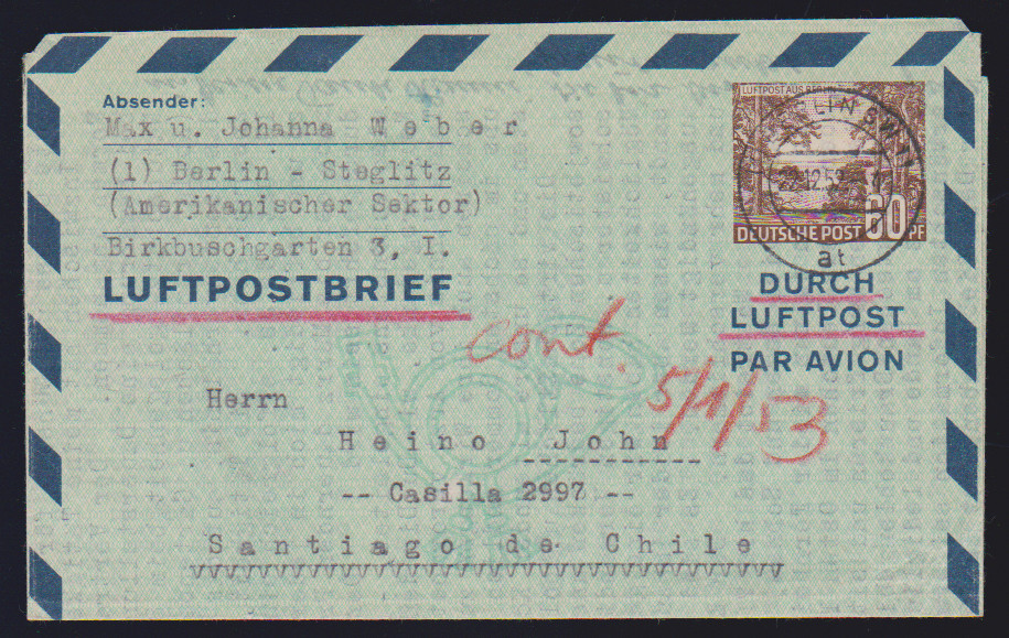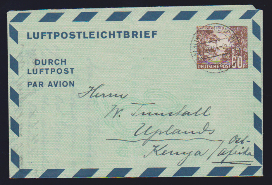 Luftpost-Faltbrief-Ganzsachen, sieben meist verschiedene gebraucht ab Berlin: LF1II, LF2aI, 2bI, bIII (nach Chile), LF3 per zwei, u.a. nach Chile, sowie LF5 nach Kenia. Mi. 505,- + (selten angeboten!)