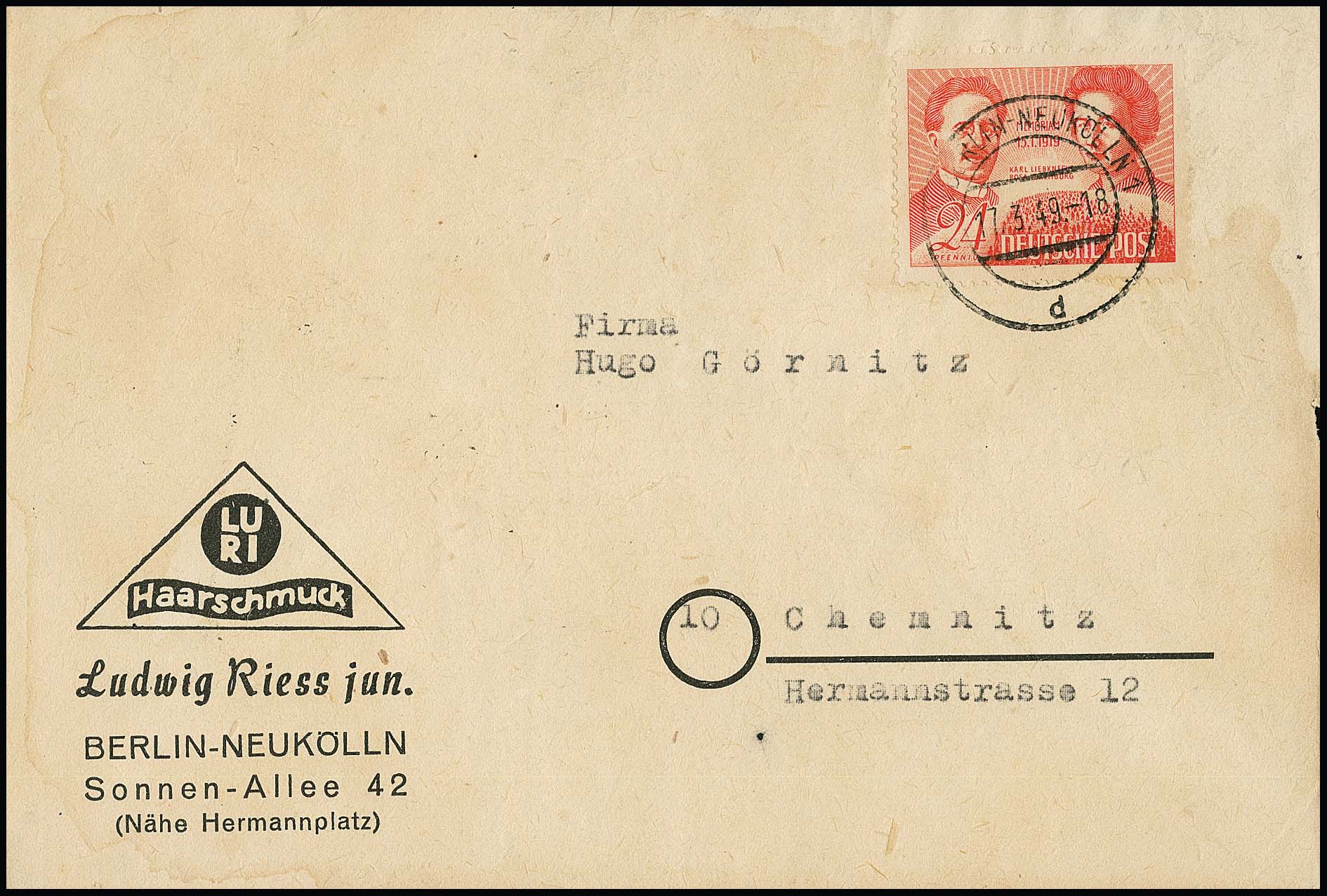 SBZ in Westberlin verwandt, 24 Pfg. Liebknecht/Luxemburg einzeln auf Couvert (dieses Gebrauchserhaltung) von Berlin-Neukölln, 1.3.49, nach Chemnitz, Attest Schlegel. Mi. 1600,-