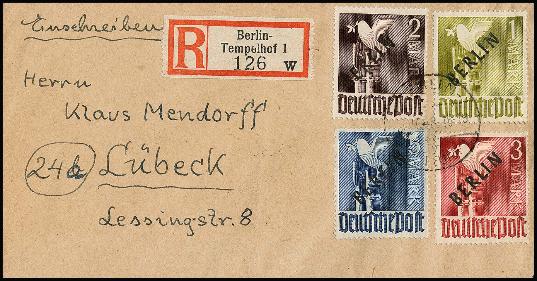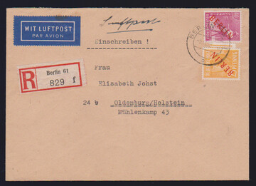 25 u. 40 Pfg. Rotaufdruck auf R-Brief (Couvert ganz leichte Mittelfalte) ab Berlin SW 61, 5.11.49, nach Oldenburg, sign. Schlegel