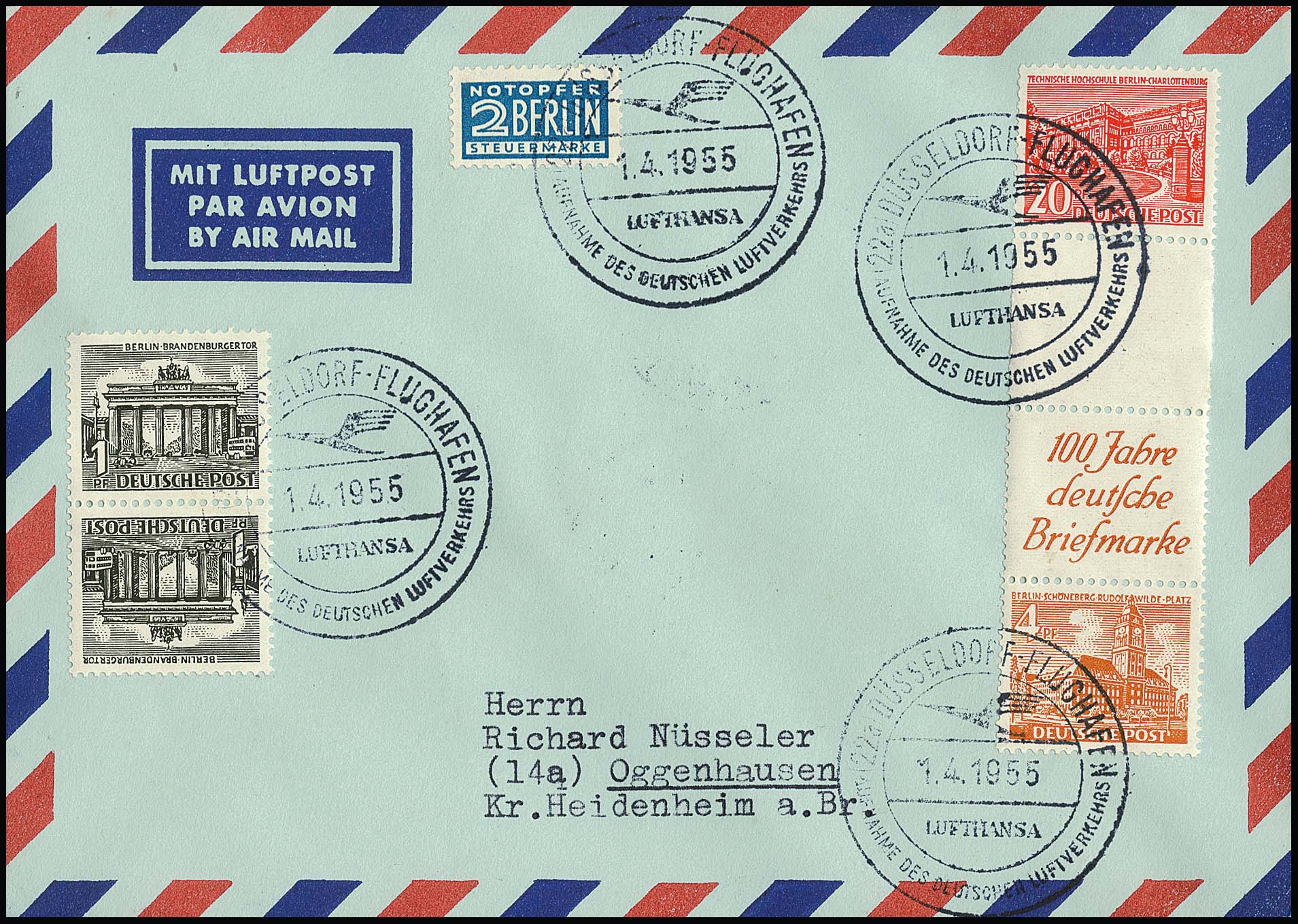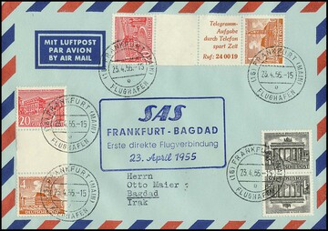20 und 4 Pfg. Bauten, senkrechter Reklame-Zwischensteg-Zusammendruck, nebst normalem Zwischensteg-Zusammendruck und SK1, auf portoger. Lupo-Erstflug-Brief 1955 nach Bagdad (!) mit rs. Ankunftsstempel. Mi. 424,-