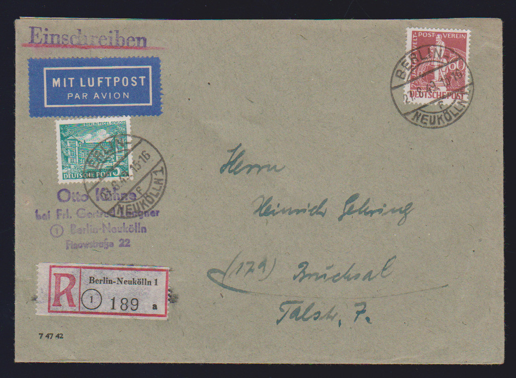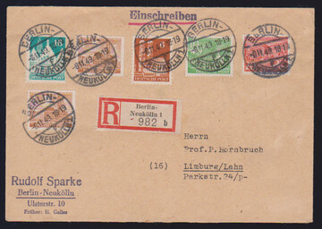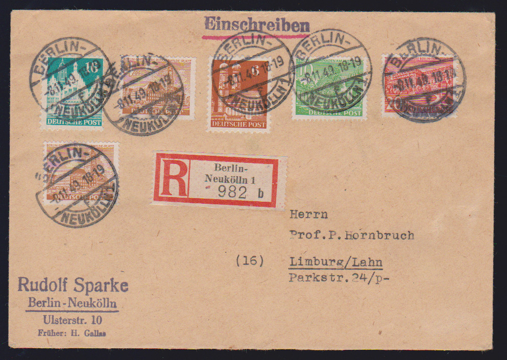 4(2), 10 u. 20 Pfg. Bauten, nebst Bizone 6 und 16 Pfg. Bauten, auf R-Brief aus Berlin-Neukölln, 8.11.49, nach Limburg