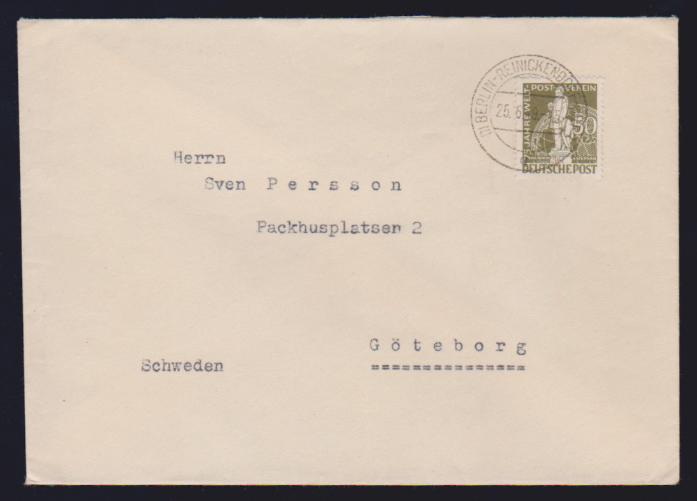 50 Pfg. UPU einzeln auf Auslandsbrief von Berlin-Reinickendorf 1949 nach Göteborg/Schweden, sowie 60 Pfg. UPU nebst 5 Pfg. Bauten auf Lupo-R-Brief aus Berlin-Neukölln