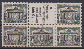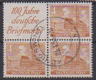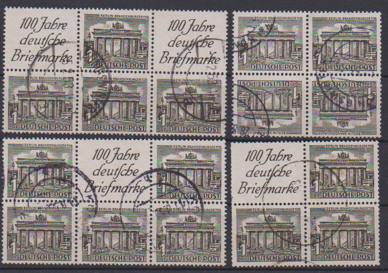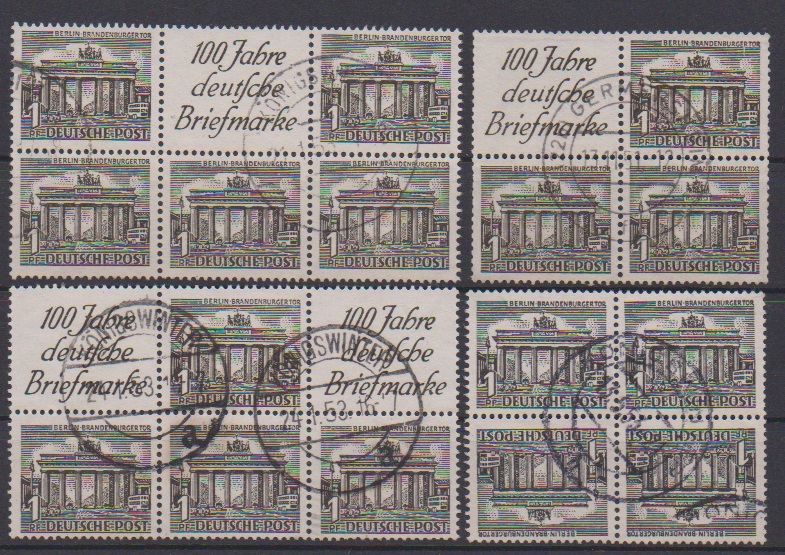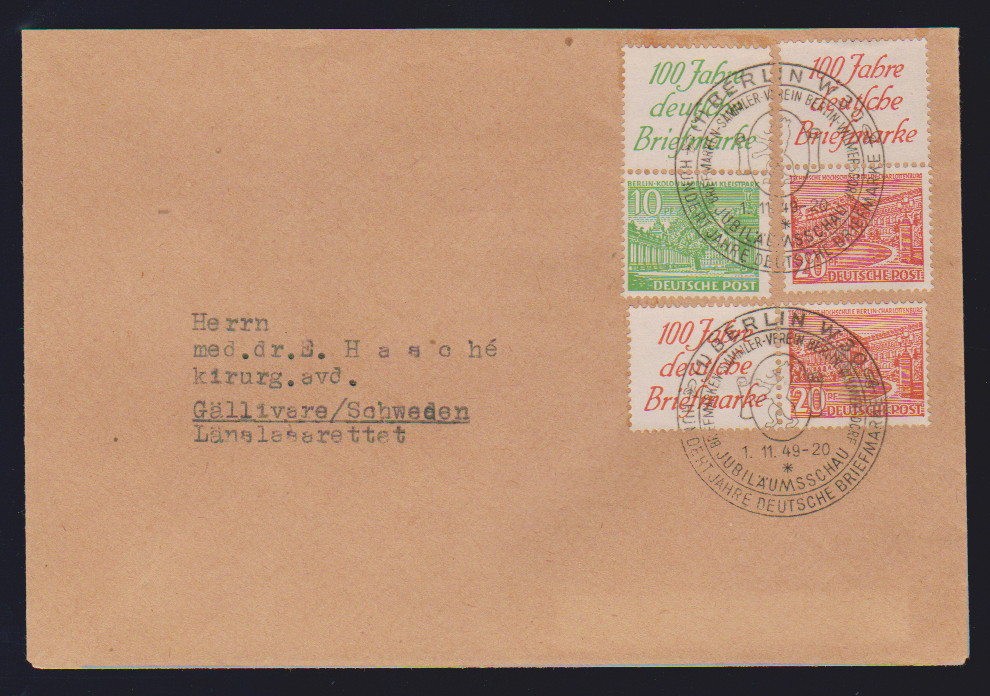 "100 Jahre deutsche Briefmarken", Bauten-Zusammendrucke 10 und zwei versch. 20 Pfg. auf portoger. Auslandsbrief ab Berlin vom Ersttag, Mi. 360,-