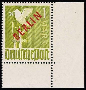 1 DM Rotaufdruck, postfrische ungefaltete rechte untere Bogenecke (Eckbug nur im Bogenrand), sign. Schlegel. Mi. 550,- ++