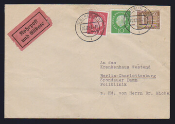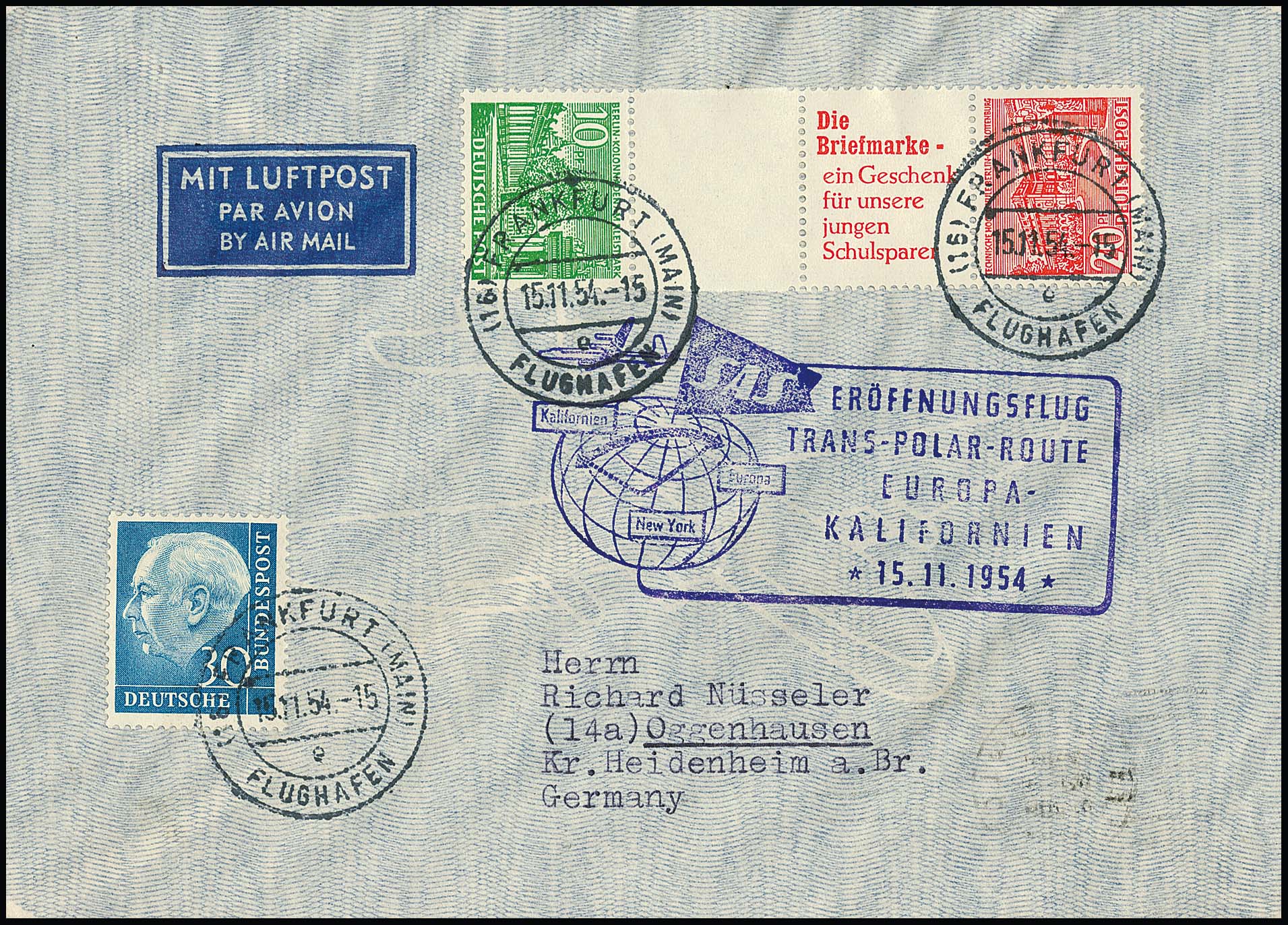 10 und 20 Pfg. Bauten, senkrechter Reklame-Zwischensteg-Kehrdruck-Zusammendruck, nebst Bund 30 Pfg. Heuss, auf Lupo-Erstflugbrief, Mi. 500,- +