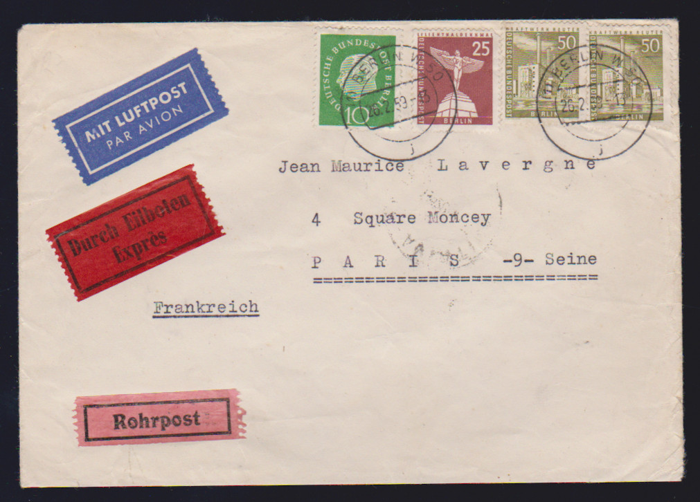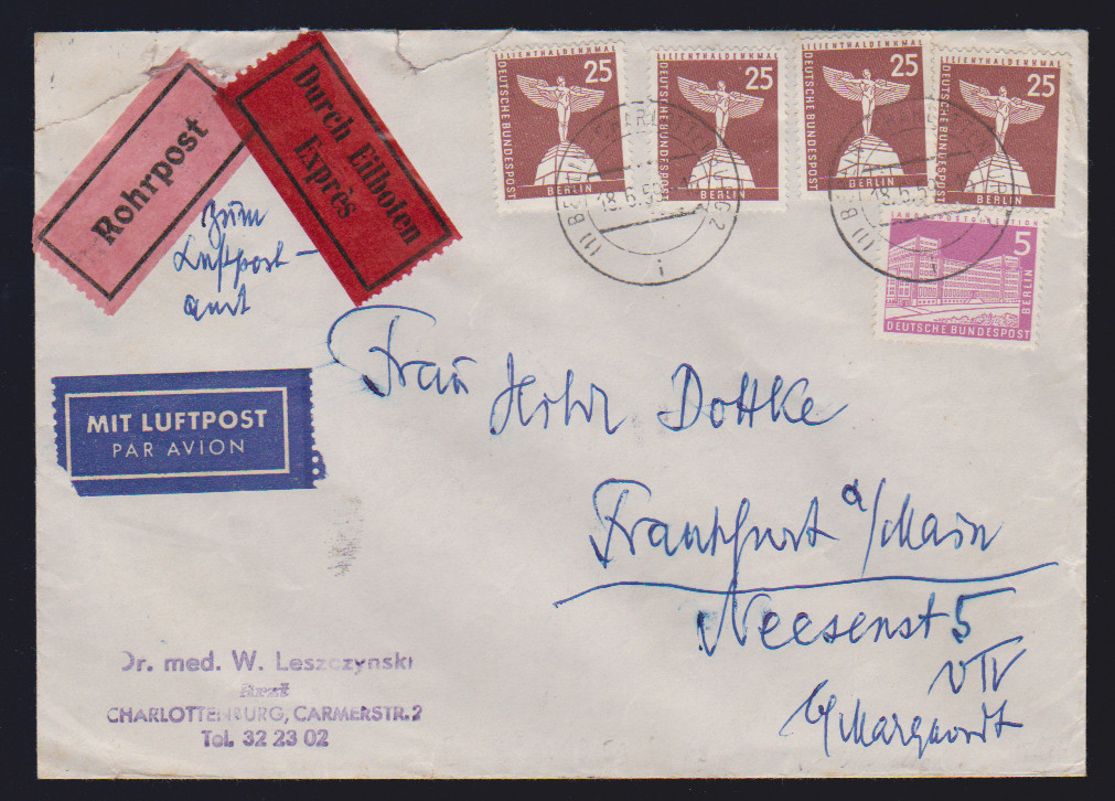 Sechs Berliner Rohrpostbriefe: Nr. 44, 47, 52, 100 u. 126 auf Lupo-Eil-Rohrpostbrief nach Fulda; Nr. 141 u. 147(4) auf Lupo-Expreß-Rohrpostbrief nach Frankfurt; Nr. 147, 150(2) u. 183 auf Lupo-Eil-Auslands-Rohrpostbrief nach Paris, Nr. 184 auf PP24 D2/001 als Lupo-Rohrpostkarte, sowie zwei Rohrpost-Ortsbriefe mit Frankaturen Nr. 150 u. 185 bzw. 151, 183 u. 184
