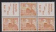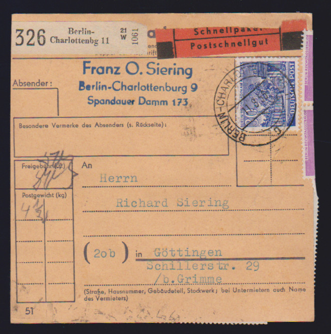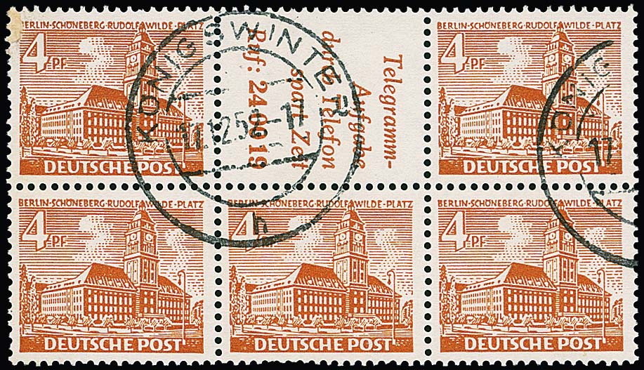 6 Pfg. Bauten per zehn, drei Werte um den Rand geklebt, aber Sechserblock in guter Erhaltung, nebst 4 Pfg. per 10, inkl. Achterblock, rs., vs. 30 Pfg., auf Paketkarte für ein Schnellpaket aus Berlin-Charlottenburg, 11.8.55