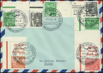10 u. 20 Pfg. Bauten, senkrechter Kehrdruck-Zwischensteg-Zusammendruck "100 Jahre deutsche Briefmarke", nebst S1, SZ1B und SZ6, auf Lupo-Brief 1955 nach Paris mit rs. Ankunftsstempel. Mi. 1234,-