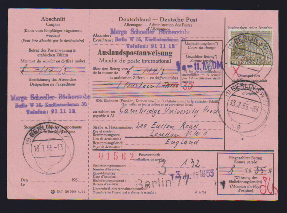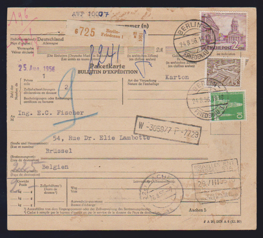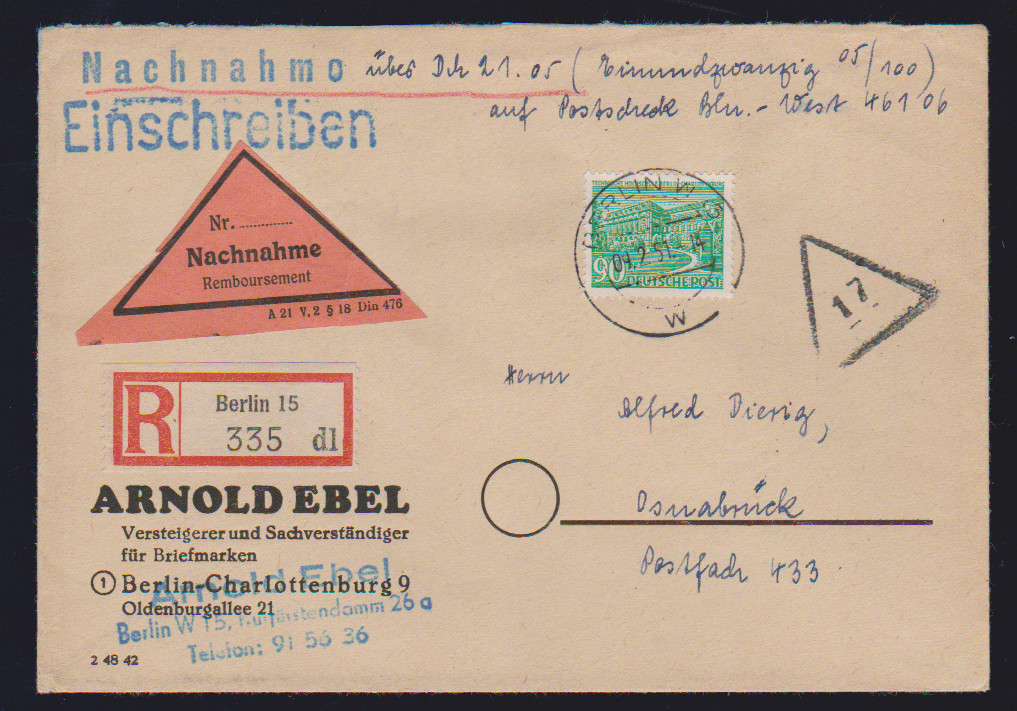 50 Pfg. Bauten als EF auf Auslands-Postanweisung von Berlin SW 1955, ferner 90 Pfg. als EF auf R-NN-Brief ab Berlin W15 1951, sowie 2 DM Bauten, nebst weiterer Frankatur, auf Auslands-Paketkarte