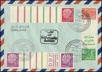 20 und 10 Pfg. Bauten, senkrechter Reklame-Zwischensteg-Zusammendruck "100 Jahre Deutsche Briefmarke", nebst Bund-Heuss-Zusammendrucken RL1 und WZ5, auf Luftpost-Erstflug-Brief 1955 nach New York mit rs. Ankunftsstempel, Mi. 1335,- +