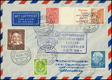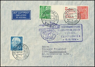 10 u. 20 Pfg. Bauten, waager. Zusammendruck "100 Jahre deutsche Briefmarke" innerhalb einer Einheit, nebst 30 Pfg. Heuss, auf portoger. Lupo-Erstflugbrief, Mi. 245,- +