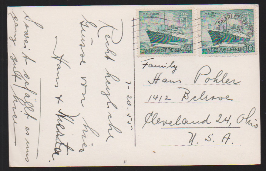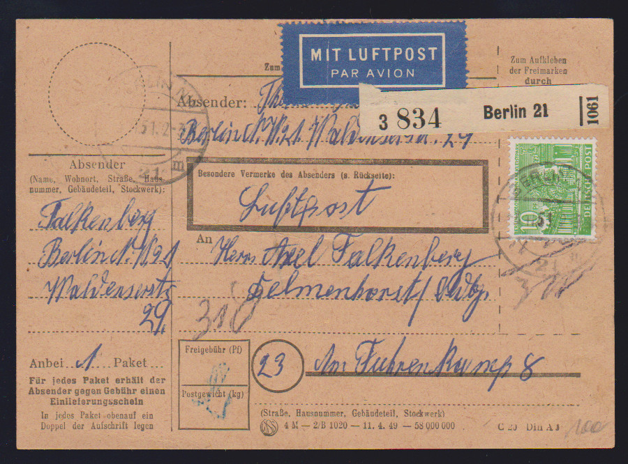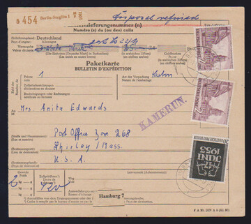 2 DM Bauten per zwei, nebst 20 Pfg. 17. Juni, auf Übersee-Paketkarte von Berlin-Steglitz, 22.11.55, in die USA