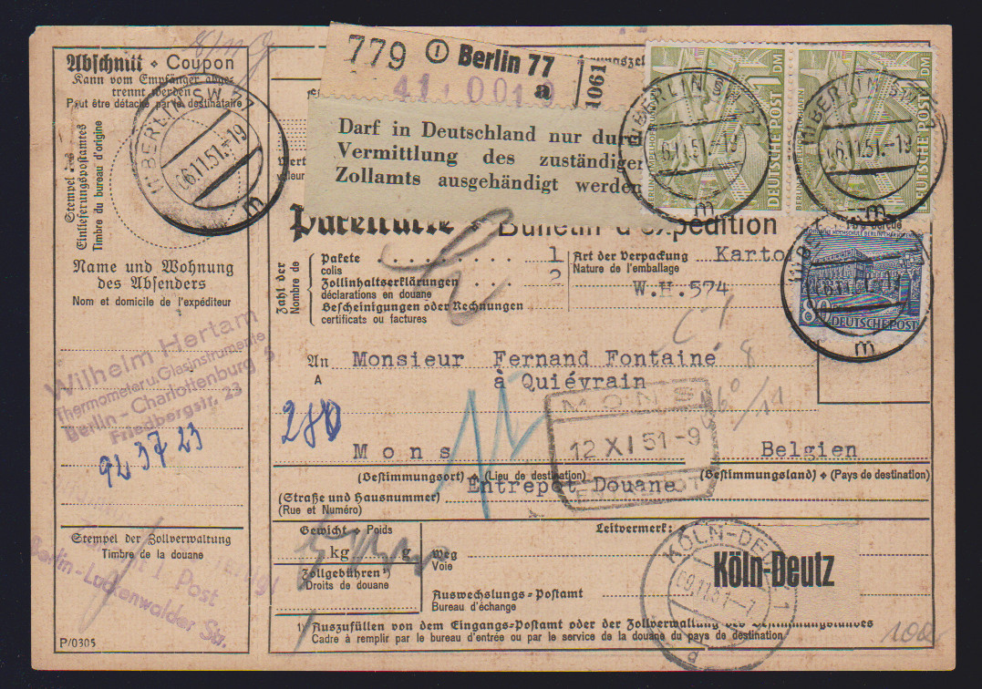 1 DM Tempelhof, unter UV schwach fluoreszierend, per zwei bzw. per drei, je nebst ZuF, auf Inlands- bzw. Auslands-Paketkarte