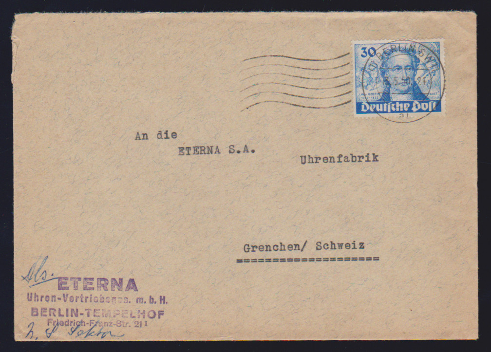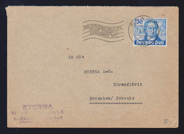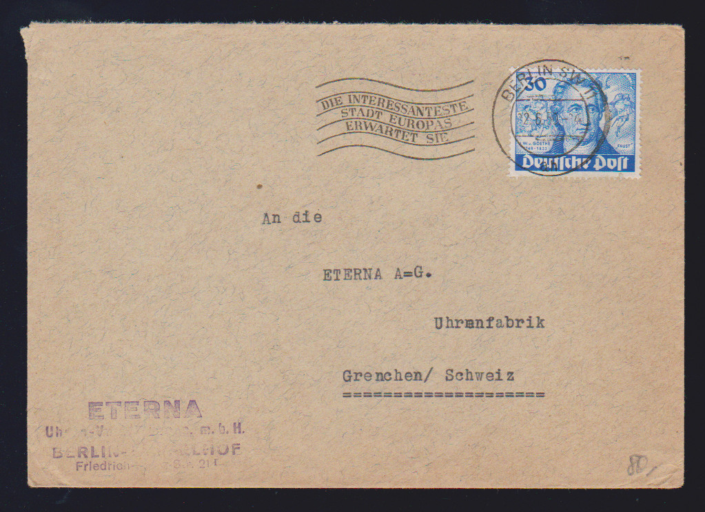 30 Pfg. Goethe als EF auf Bedarfs-Auslandsbrief von Berlin SW 11 1950 in die Schweiz, Mi. 200,-