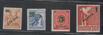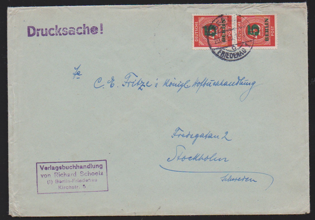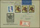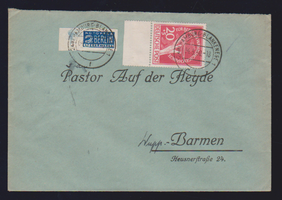 10 + 5 Pfg. Währungsgeschädigte je einzeln auf zwei Postkarten, einmal ab Berlin, sowie 20 + 5 Pfg. auf portoger. Fernbrief (rs. fehlt die obere Viertelklappe), Mi. 1360,- + (zwei Randstücke)