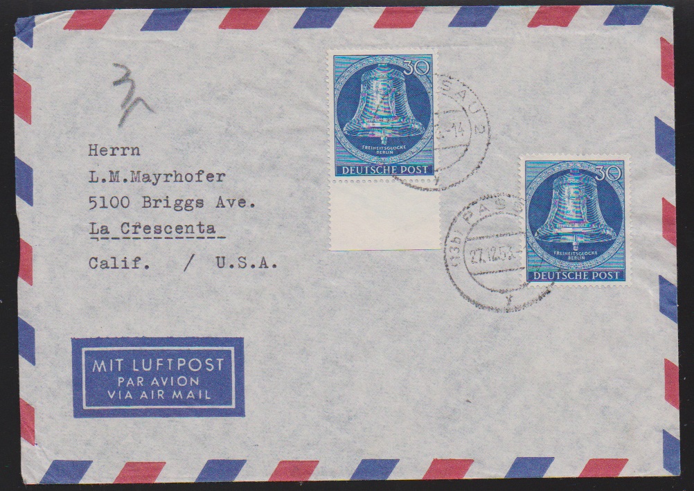 Sechs gute Belege je mit Mehrfach-Frankaturen: Nr. 64 im Paar auf Auslands-Drucksache, dito Nr. 92, Nr. 126 per zwei auf Überseekarte, Nr. 104 (30 Pfg. Glocke Mitte) per zwei auf Überseebrief in die USA, Nr. 139 per zwei auf Überseebrief, sowie Nr. 158 (25 + 10 Pfg. Postillion) im Dreierstreifen als gute MeF auf R-Brief aus Berlin-Friedenau