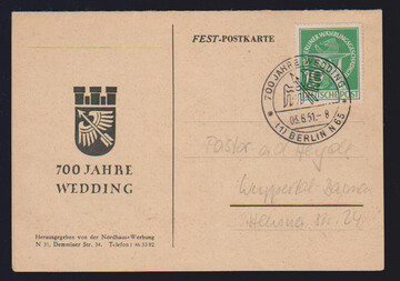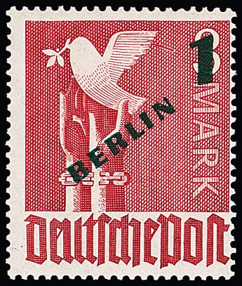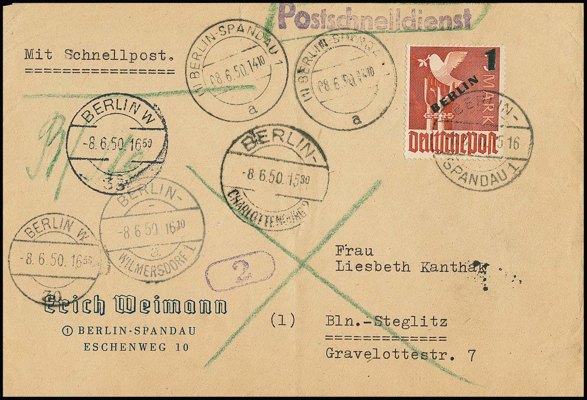 1 Mk. Grünaufdruck einzeln auf seltenem Postschnelldienst-Ortsbrief (Couvert leichte Mittelfalte ausserhalb) ab Berlin-Spandau, 8.6.50