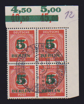 5 a. 45 Pfg. Grünaufdruck im Plattendruck-Viererblock aus der rechten oberen Bogenecke mit zentr. SST