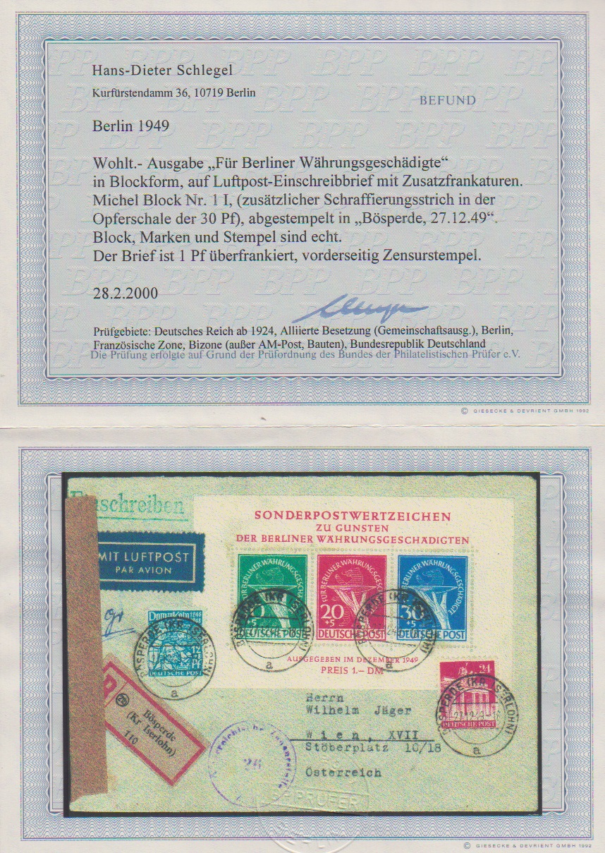 Währungsgschädigten-Block nur mit Plattenfehler I (selten, Mi. "-.-", II schon 3500,-, normaler Block 2200,-), nebst Bizone 12 u. 24 Pfg. auf Zensur-Auslands-Lupo-R-Brief aus Bösperde (Rate 95 Pfg.) nach Wien, Attest D. Schlegel