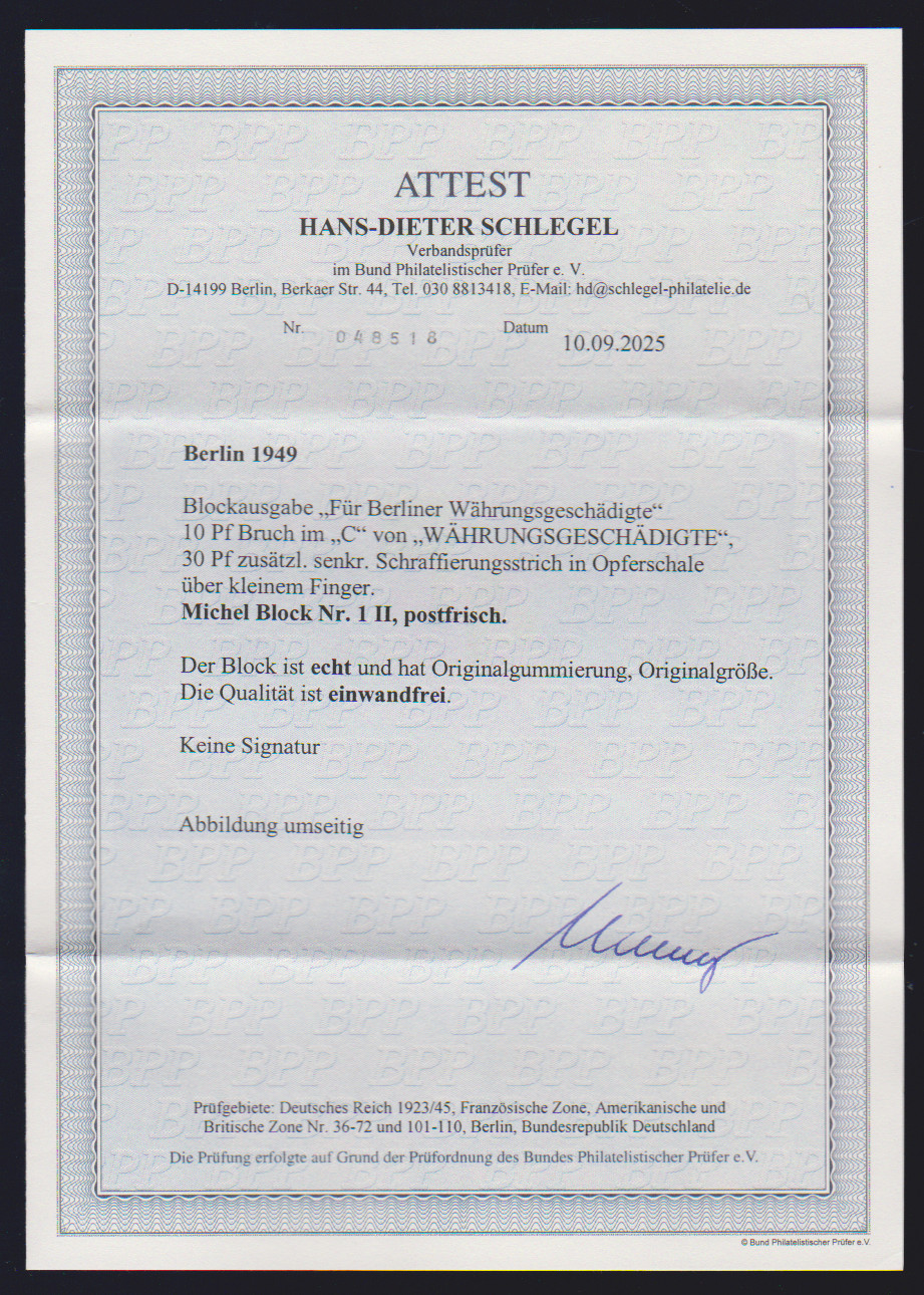 Währungsgeschädigten-Block postfrisch mit Plattenfehler bei der 30 Pfg. ("zusätzlicher Schraffierungsstrich"). Michel ohne Preis, da deutlich seltener als Block 1II mit beiden PF, sign. Schlegel