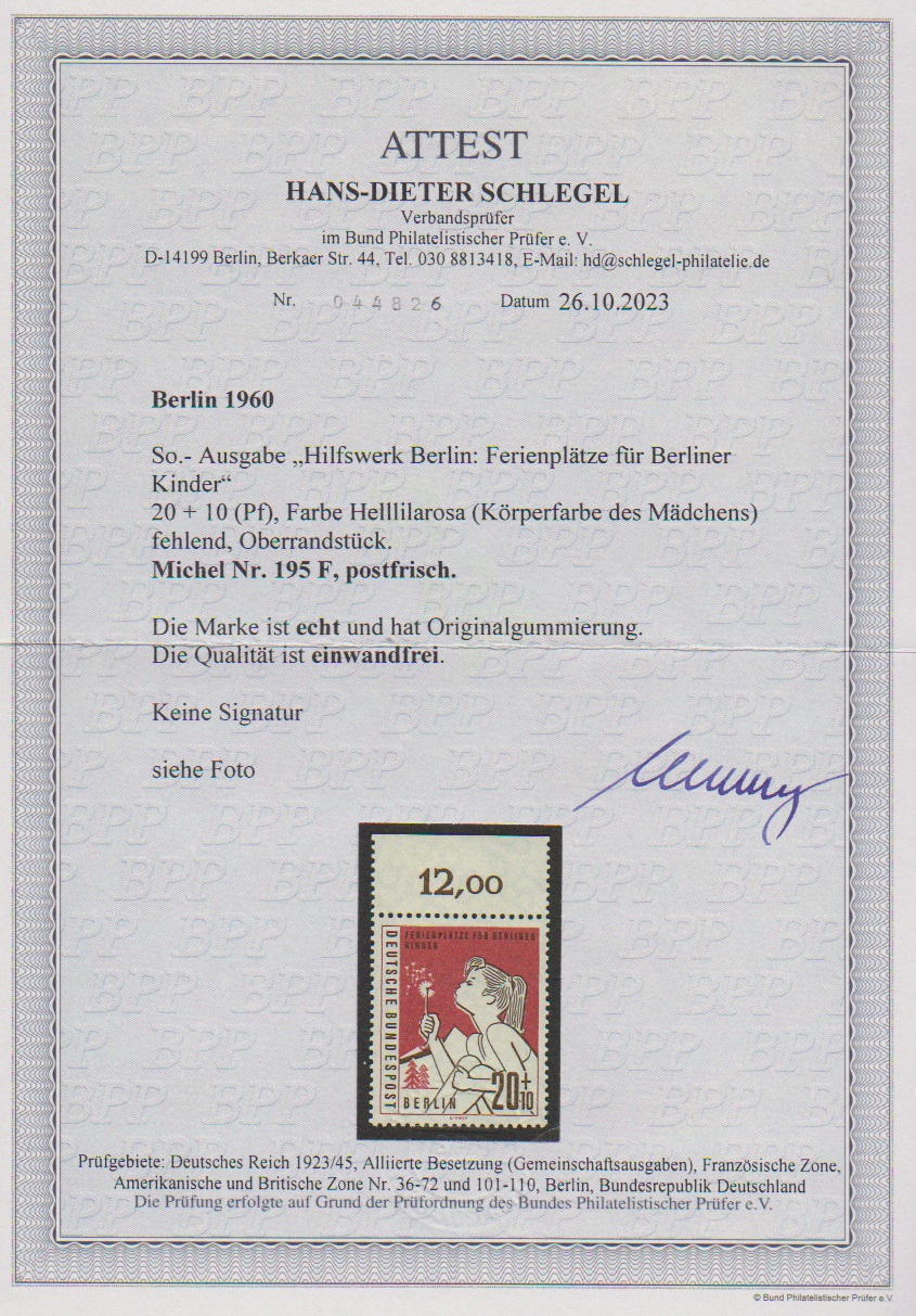 20 + 10 Pfg. Hilfswerk, Abart "Körperfarbe des Mädchens fehlend", als postfrisches Oberrandstück, Attest Schlegel. Mi. 650,-