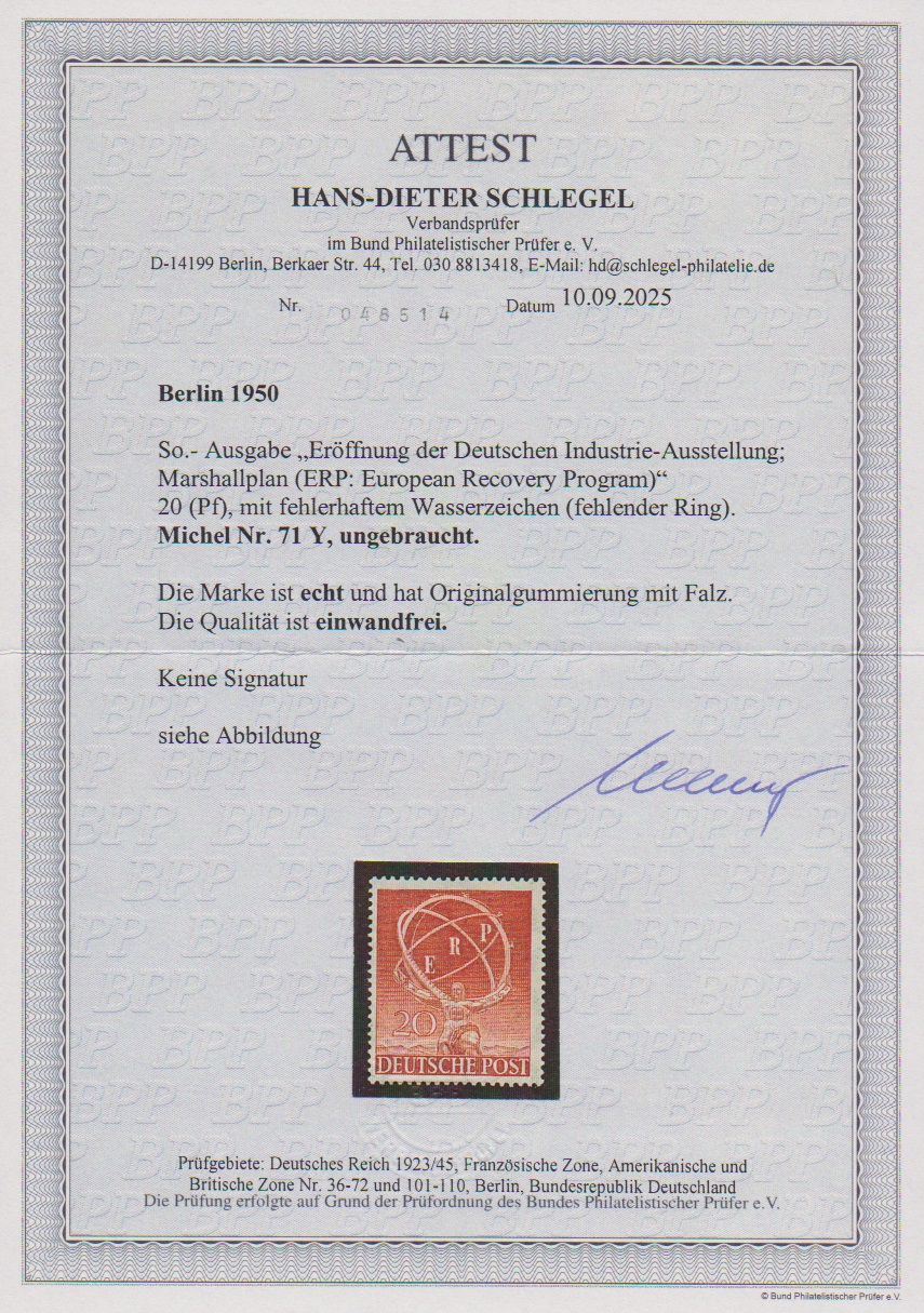 ERP mit Wasserzeichen-Abart "fehlender Ring" tadellos ungebraucht, Attest D. Schlegel (2025). Mi. 2000,-