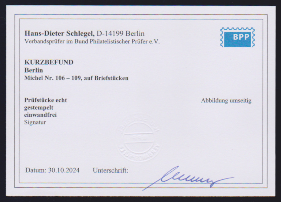10 Pfg. Dürer im Viererblock aus der rechten oberen Bogenecke, mit Druckerzeichen "8" auf Briefstück mit Rundstempel "Berlin", Mi. 60,- +