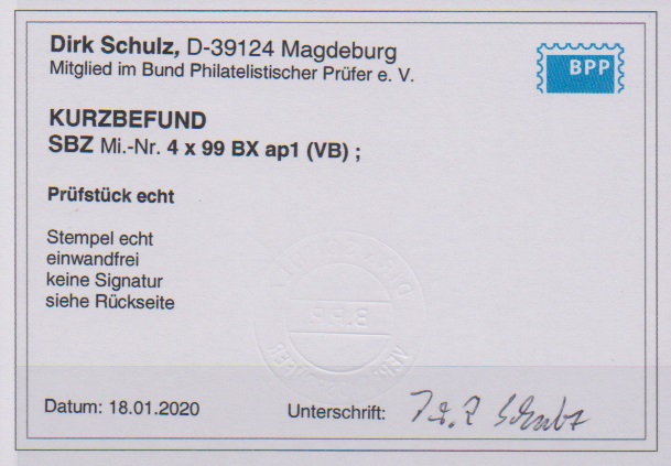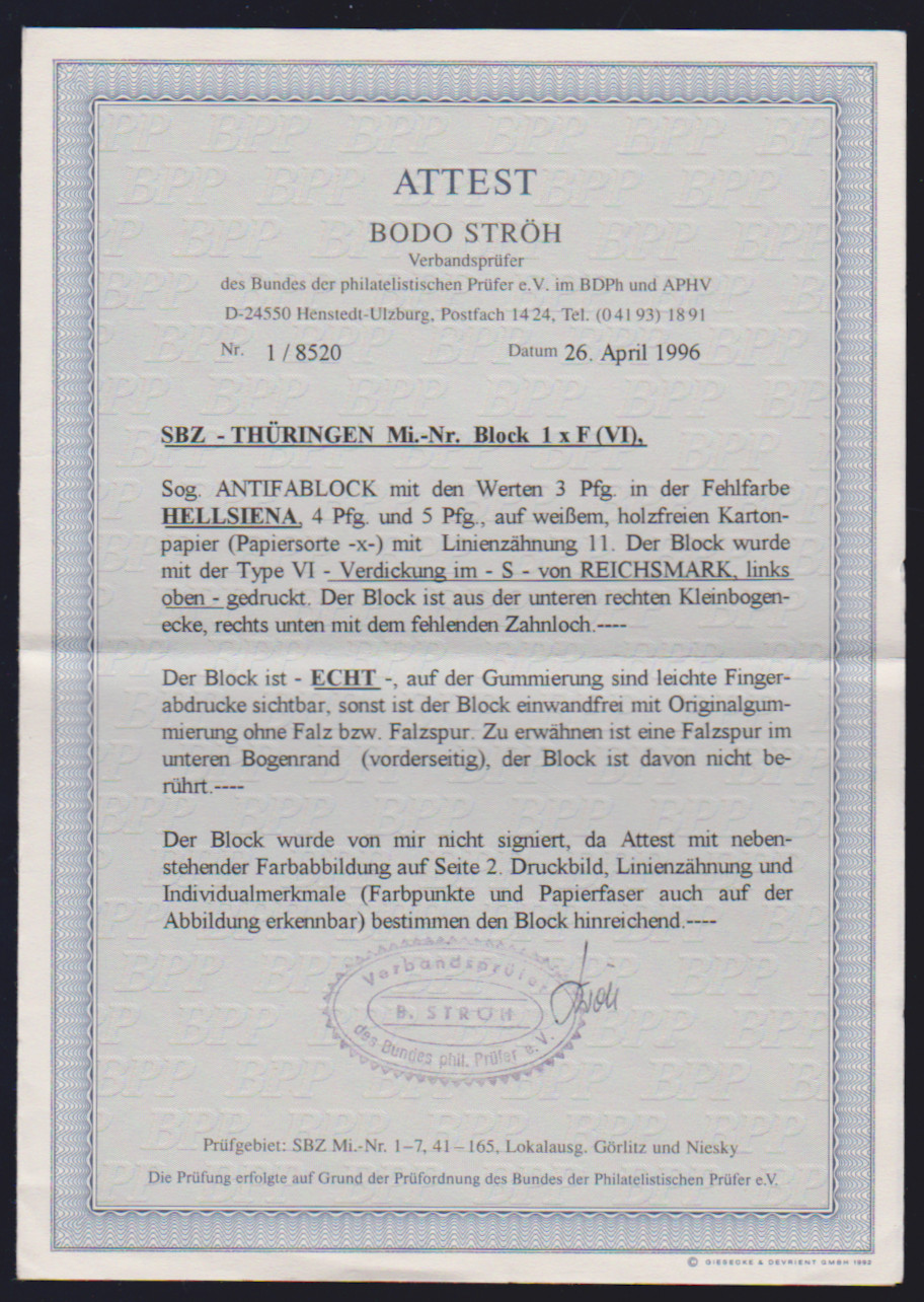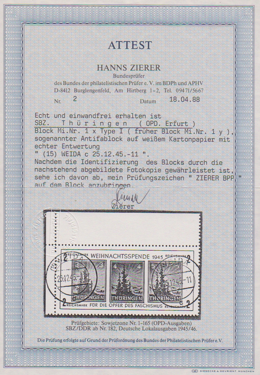 Antifa-Block auf x-Papier als linke obere Bogenecke mit Stempel "Weida", sign. mit Attest Zierer. Mi. 1100,-