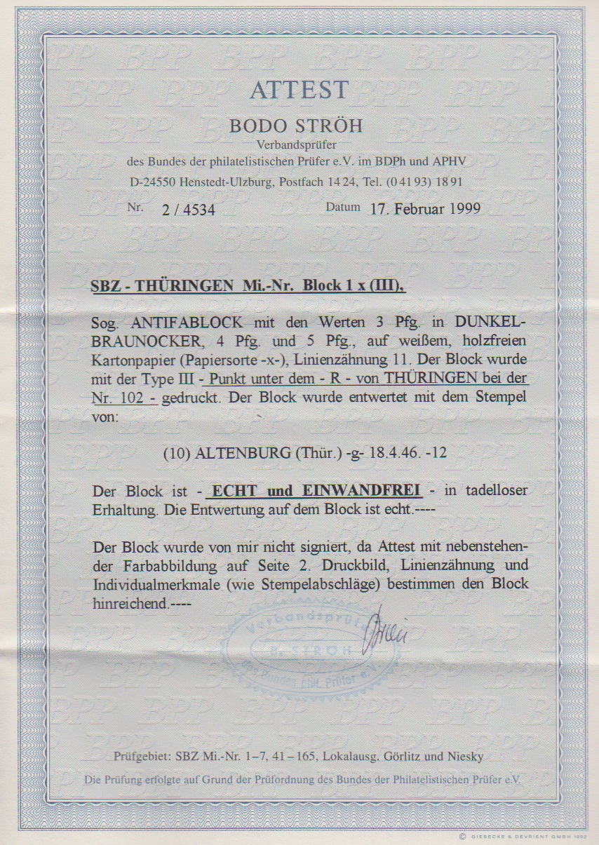 Antifa-Block tadellos gestempelt "Altenburg", Attest Ströh. Mi. 1100,-