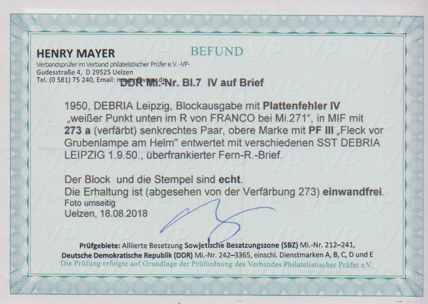 Debria-Block mit Plattenfehler IV nebst 12 Pfg. Mansfeld per zwei (einmal kl. Spalt, diese ebenfalls mit Plattenfehler III) auf überfrankiertem, links geöffnetem Reco-Brief mit entspr. SST. Fotoexp. Mayer. Mi. "-.-"