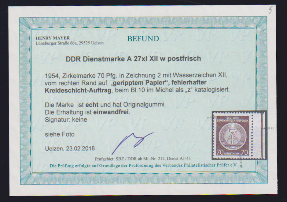 Dienst A, "Hammer und Zirkel", 70 Pfg. in Type xI XIIw, auf seltenem geripptem Papier (fehlerhafter Kreideschicht-Auftrag) als tadellos postfrisches Randstück, bisher nur wenige Exemplare dieser Variante bekannt. Fotoexp. Mayer. Mi. ohne Bewertung