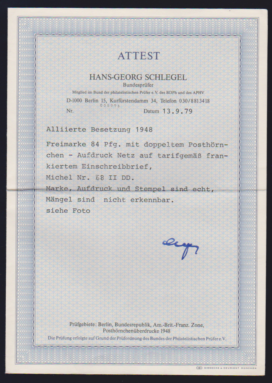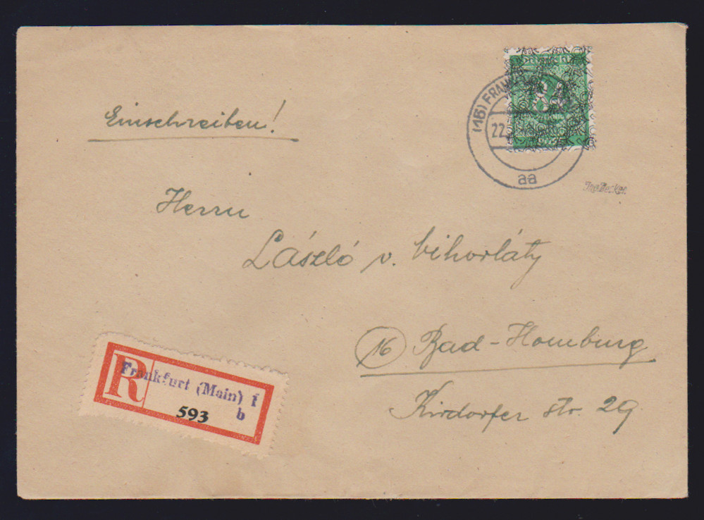 84 Pfg. Ziffern mit doppeltem Netzaufdruck als Einzelfrankatur auf R-Brief aus Frankfurt, Attest Schlegel. Mi. 250,- +
