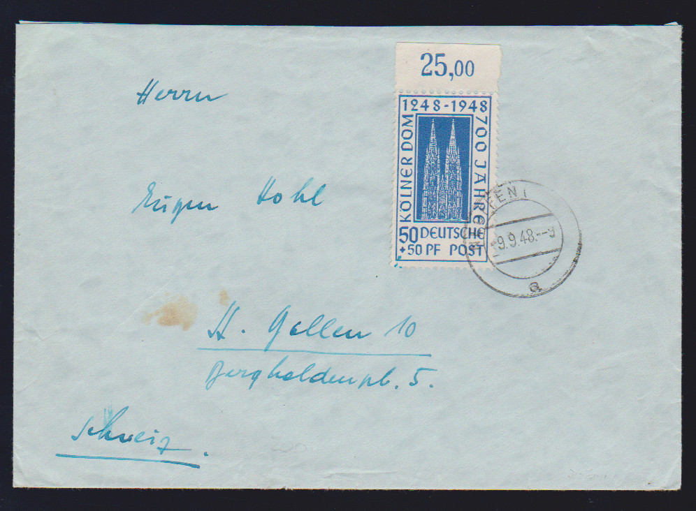 50 + 50 Pfg. Kölner Dom vom Oberrand als EF auf Bedarfs-Auslandsbrief von Neuffen 1948 in die Schweiz
