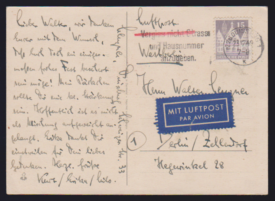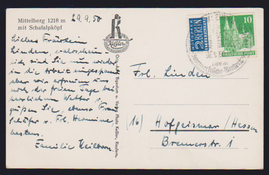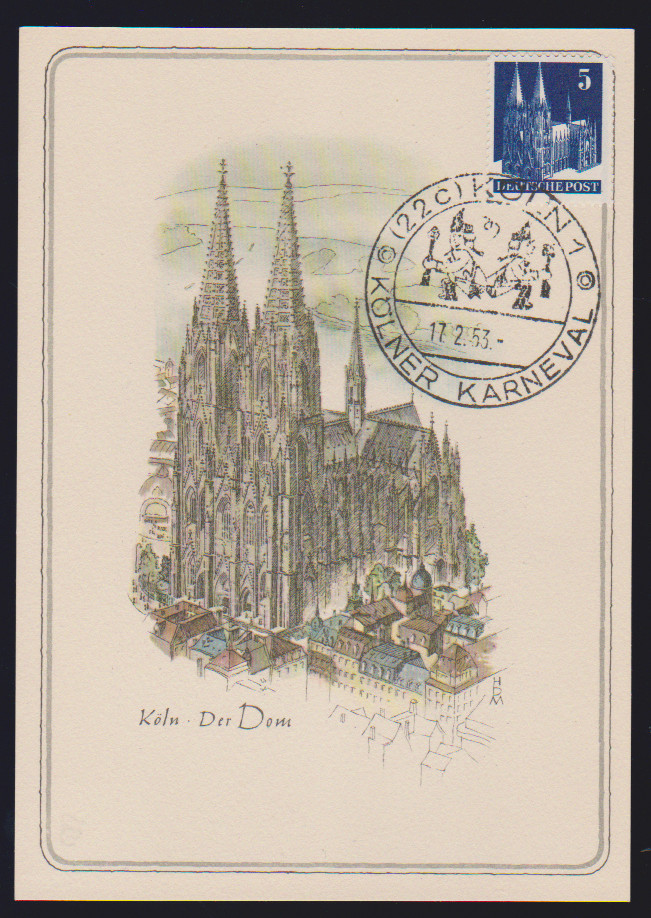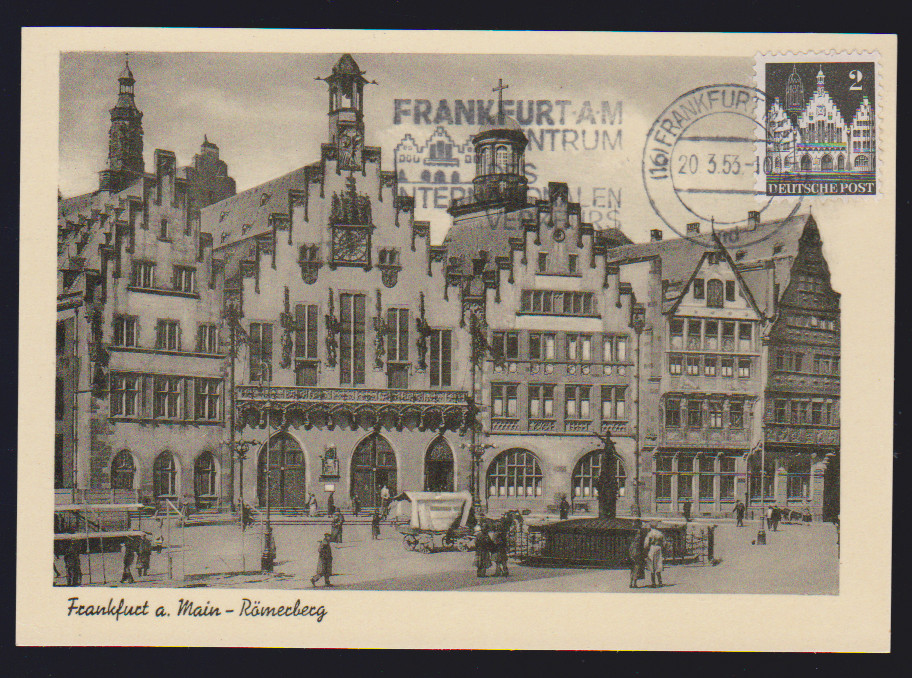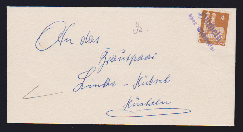 Bauten, sieben bessere Belege: 2 Pfg. auf MK, 4 Pfg. eg auf Drucksache mit violettem Landpost-L2 "Hücheln über Eschweiler", 5 Pfg. auf MK "Kölner Karneval", 10 Pfg. als EF auf seltener Postkarte aus Riezlern/Kleinwalsertal, 15 Pfg. wg, lila, als EF auf Lupokarte, 25 Pfg. wg im Paar aus MeF auf Auslandsbrief, sowie bessere Ganzsachenkarte 20 Pfg. (P3) als Auslandskarte gebraucht