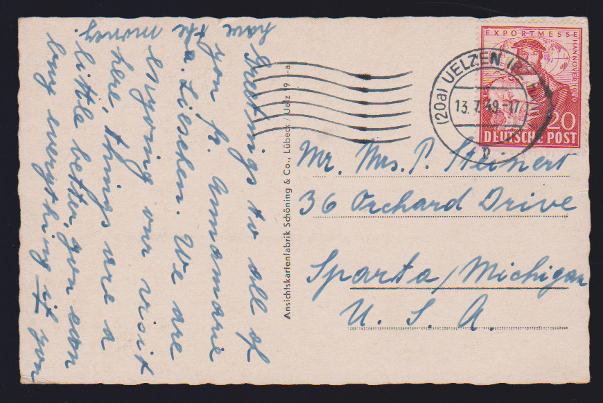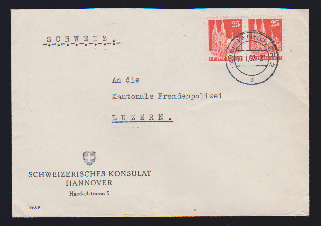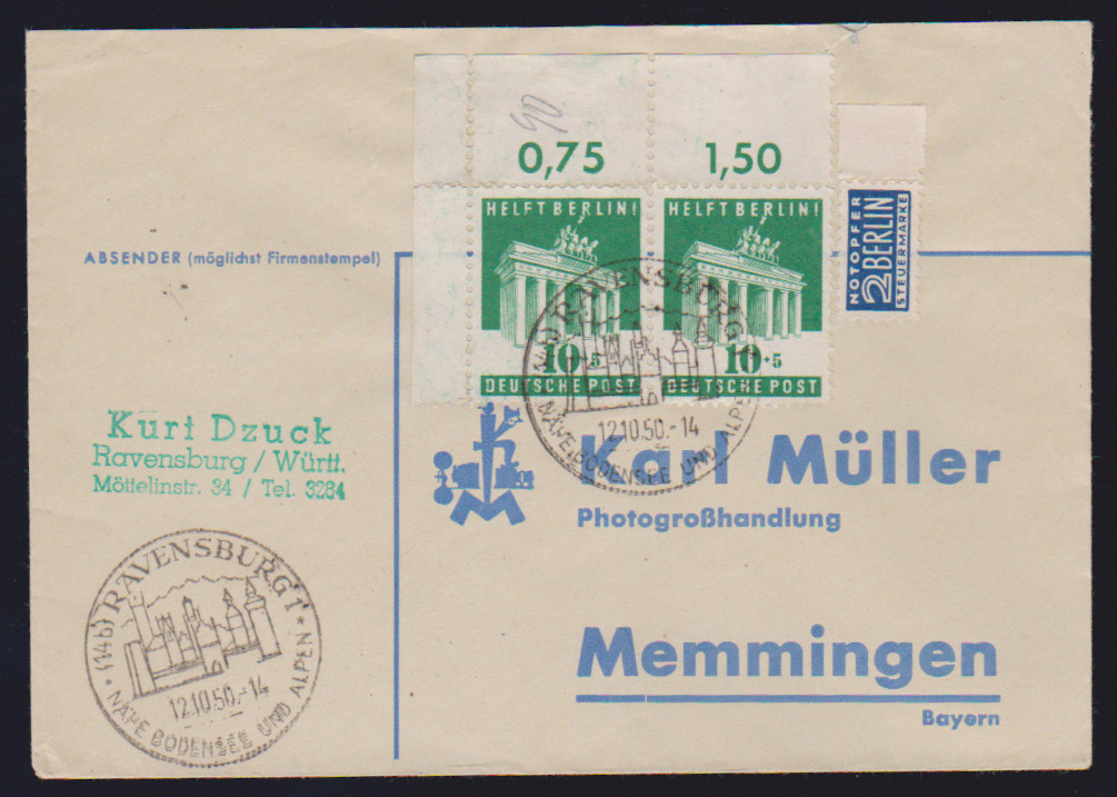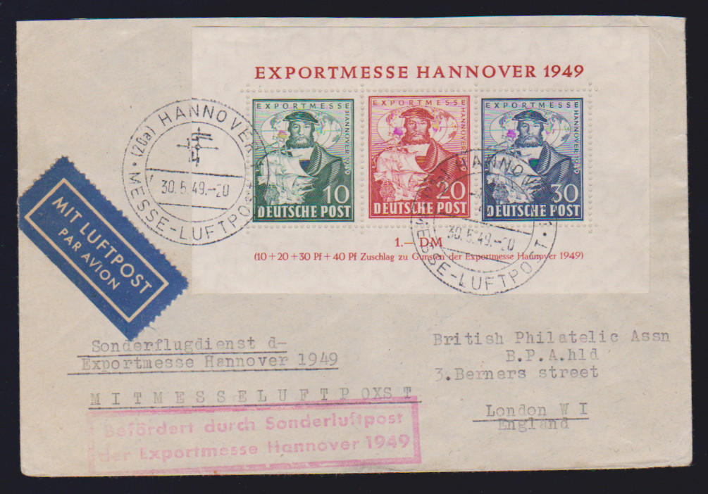 10 Pfg. Berlinhilfe im Paar aus der linken oberen Bogenecke als MeF auf Brief, ferner 20 Pfg. Hannover-Messe als EF auf Überseekarte in die USA, Exportmesse-Block auf Lupobrief von Hannover nach London, sowie Radrennen 20 Pfg. (Nr. 107) auf sauberem Brief