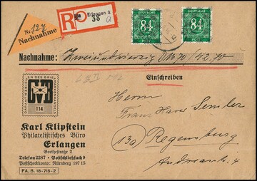 84 Pfg. Ziffern mit Bandaufdruck per zwei auf NN-Einschreibebrief aus Erlangen 1948
