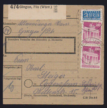 80 Pfg. Bauten wg im Paar als Mehrfach-Frankatur auf Paketkarte aus Gingen/Wtb. 1948