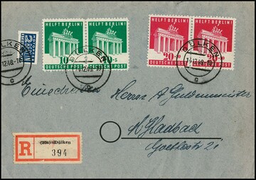 Berlin-Hilfe je in Paaren auf portoger. R-Brief vom Ersttag, Mi. 750,- +
