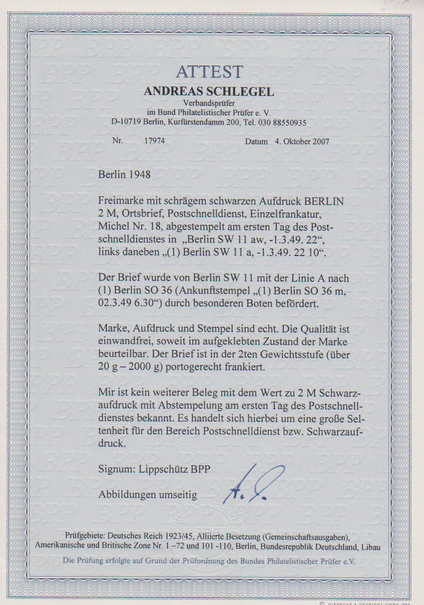 2 Mk. Schwarzaufdruck als sehr seltene Einzelfrankatur auf portogerechtem Orts-Postschnelldienstbrief vom Ersttag des Postschnelldienstes, 1.3.49. Sowohl seltene Einzelfrankatur-Variante als auch bisher einzig bekannter Brief mit der 2 Mark Schwarzaufdruck vom Ersttag des Postschnelldienstes, Unikat. Sign. Lippschütz und Attest A. Schlegel. Foto siehe Titelseite