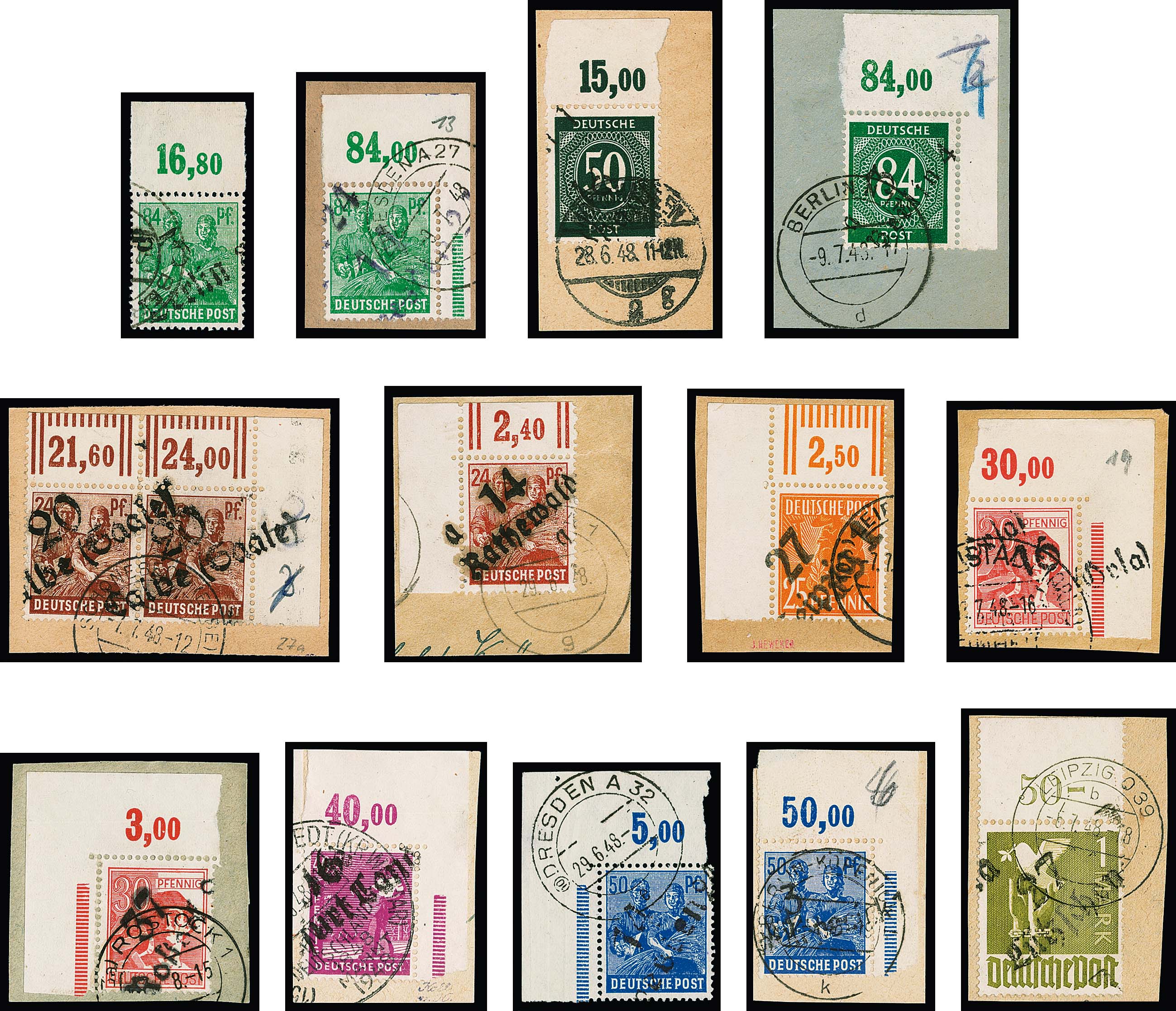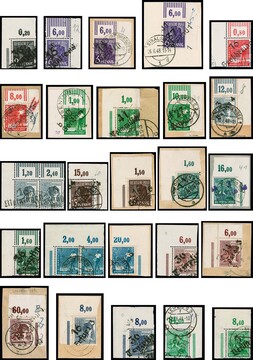 Bezirkshandstempel, 111 (!) gestempelte Oberrandstücke in guter Sortierung, davon 68 Bogenecken links oder rechts oben (einmal auf Brief), alle mit sinnvollen BPP-Signaturen und auch vielen seltenen Stücken, der Michel bewertet diese mangels Angebot nicht und der Kenner weiß, dass auch mit "Geld und guten Worten" eine solche Menge nur über Jahrzehnte zusammenzutragen ist!