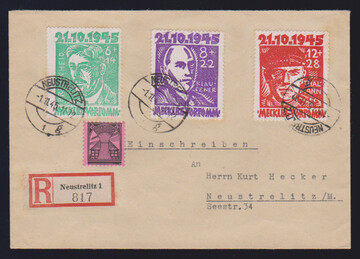 Opfer des Faschismus, komplette Serie, nebst unentwerteter 12 Pfg., auf Orts-R-Brief aus Neustrelitz, sign. Zierer. Mi. lose 240,-