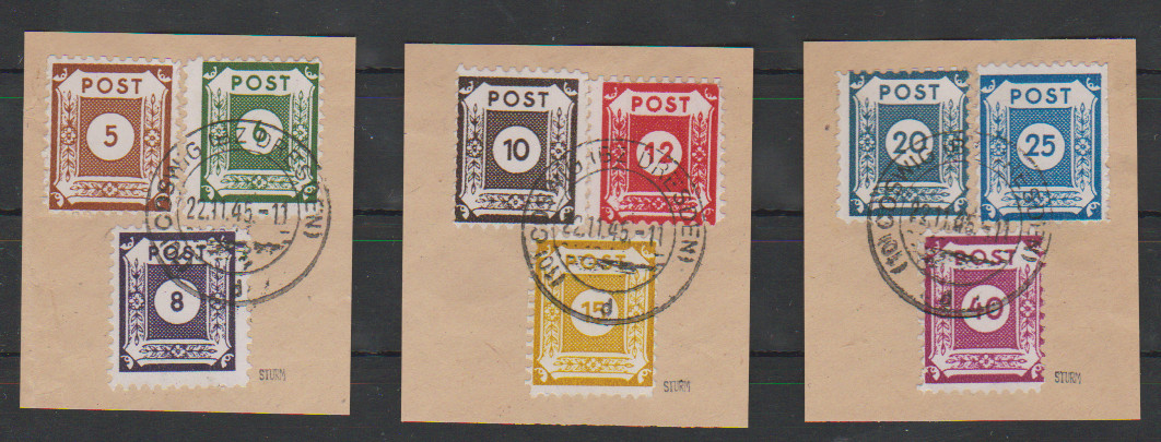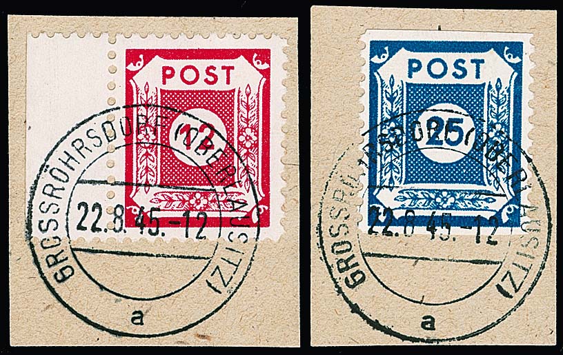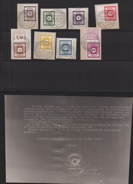 Freimarken, nur senkrecht gezähnt L10 1/2 (Großröhrsdorf), komplette Serie auf Briefstücken, sowie zusätzlich 10 Pfg. mit der Versuchszähnung L10 1/2 allseits, vom Rand ebenfalls auf Briefstück (Auflage lt. Aktennotiz 500 Ex.), Mi. 2200,-