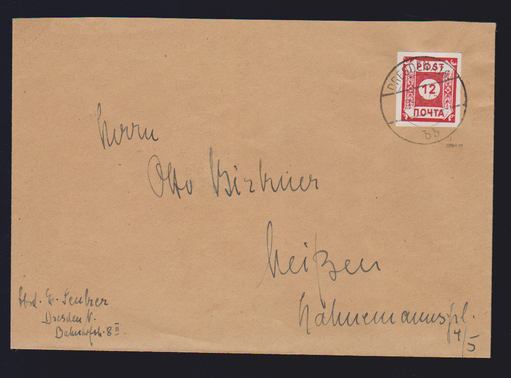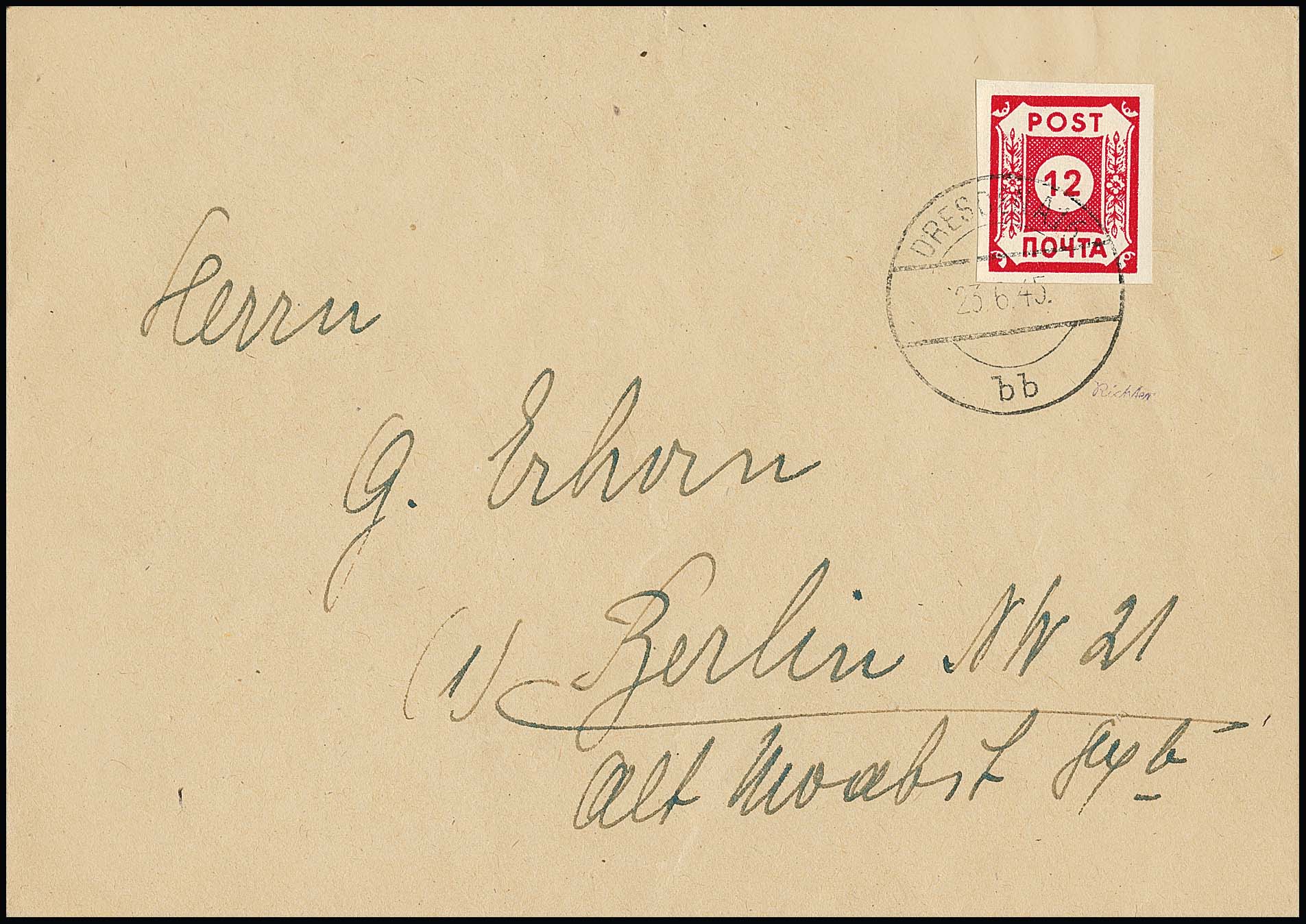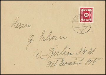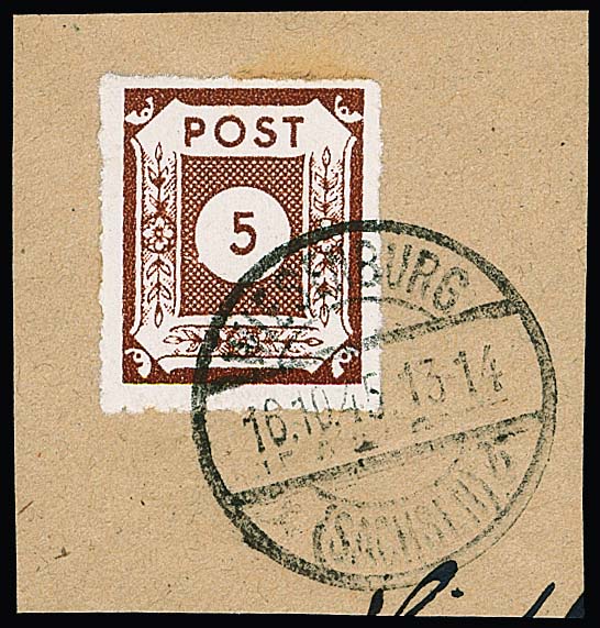 "POTSCHTA", Ölfarbe, mit Plattenfehler "Dorn am untersten Blatt" auf typisch gefälligkeitsgestempeltem Brief, sign. Ströh. Mi. lose 1000,-