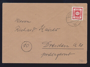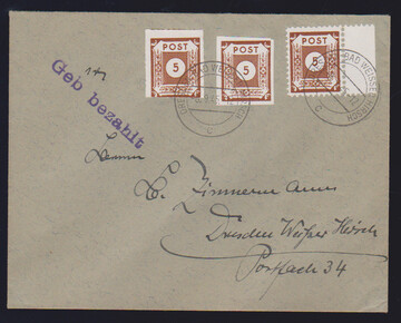 Freimarken, gez. Coswig L10, kpl. Serie, dabei 12 Pfg. in "b"-Nuance, auf Briefstücken, sowie 3 Pfg., nebst Nr. 42G (Loschwitz) und 42A, auf Ortsbrief, Mi. 405,-