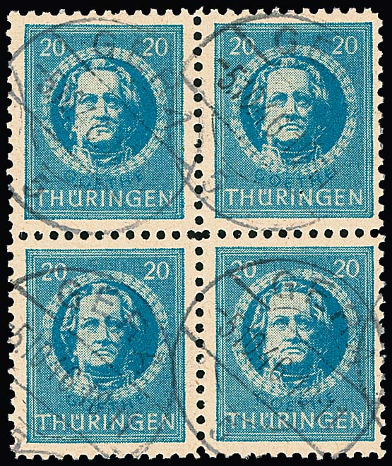 20 Pfg. preußischblau, gutes Papier, im tadellos gestempelten Viererblock, Attest Schulz. Mi. 1000,- +