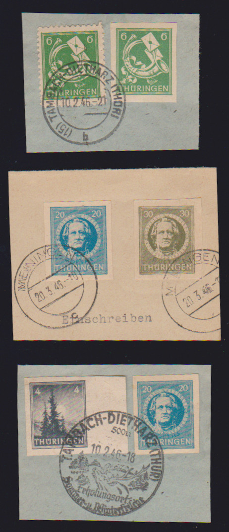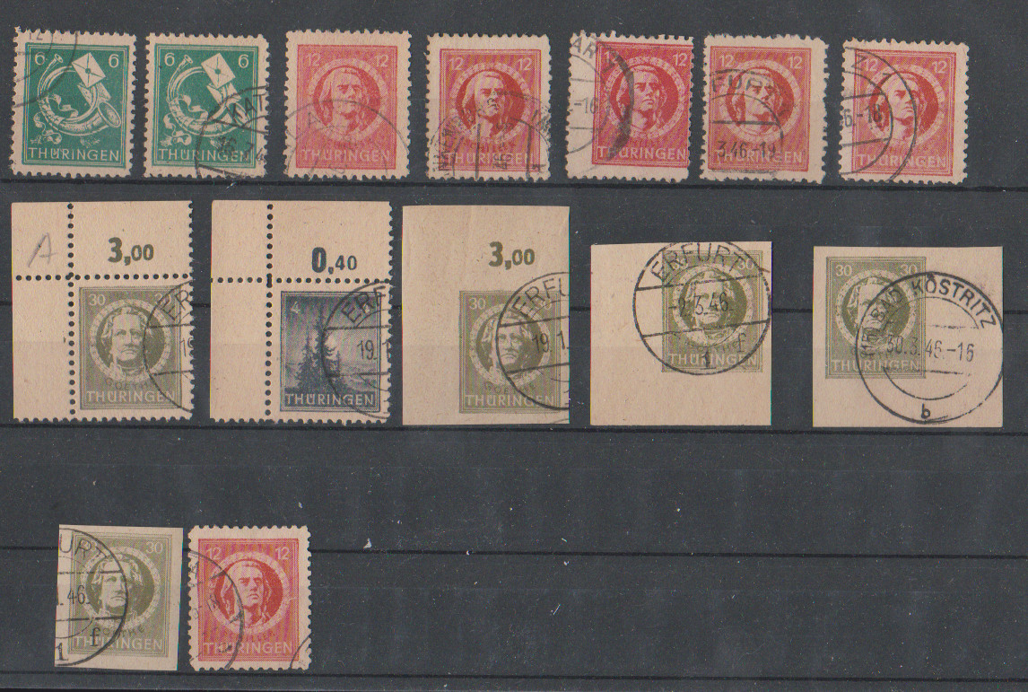 Thüringen, 15 gestempelte Farben, alle tiefst BPP-gepr. (Jasch, Schulz, Ströh), inkl. Nr. 93AYz2, 95AYbz1/2, 97AX in ar und bp2, 97AY in az1/2, bz1/2, by, 99AYbz2, sowie BX in au, at und az2. Mi. 1087,-, da z.B. vier Bogenecken enthalten